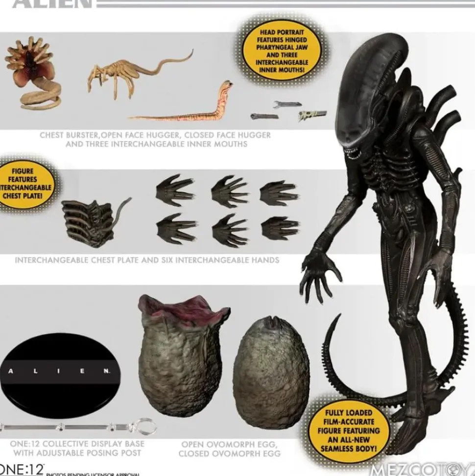 “In space, no one can hear you scream.” The One:12 Collective Alien features an all-new seamless body designed with an internal skeleton armature that is durable yet highly posable. The hostile xenomorph is equipped with a hinged pharyngeal jaw and interchangeable inner mouths, as well as an interchangeable chest plate pierced by the ASSO-400 Harpoon Grappling Gun, as seen in the final scene of the movie. Alien is fully loaded with film-accurate accessories including a coiled Facehugger that can fit over the heads of most other One:12 Collective figures, an open Facehugger, a Chestburster, and an open and closed Ovomorph egg. The crew aboard the Nostromo are awakened from their cryo-sleep to investigate a distress call from an alien vessel. After the crew encounters a nest of eggs inside the alien ship, terror begins as they realize they are not alone.
