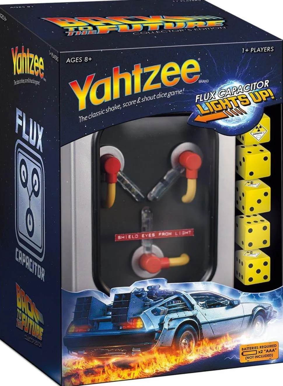 Great Scott! Yahtzee, America’s all-time #1 dice game, takes on 1985’s classic time traveling movie, Back to the Future! Includes a collectible light-up Flux Capacitor dice cup, 5 custom dice, score pad, and pencil. Classic shake-and-score action that keeps the fun rolling! 1+ Players.