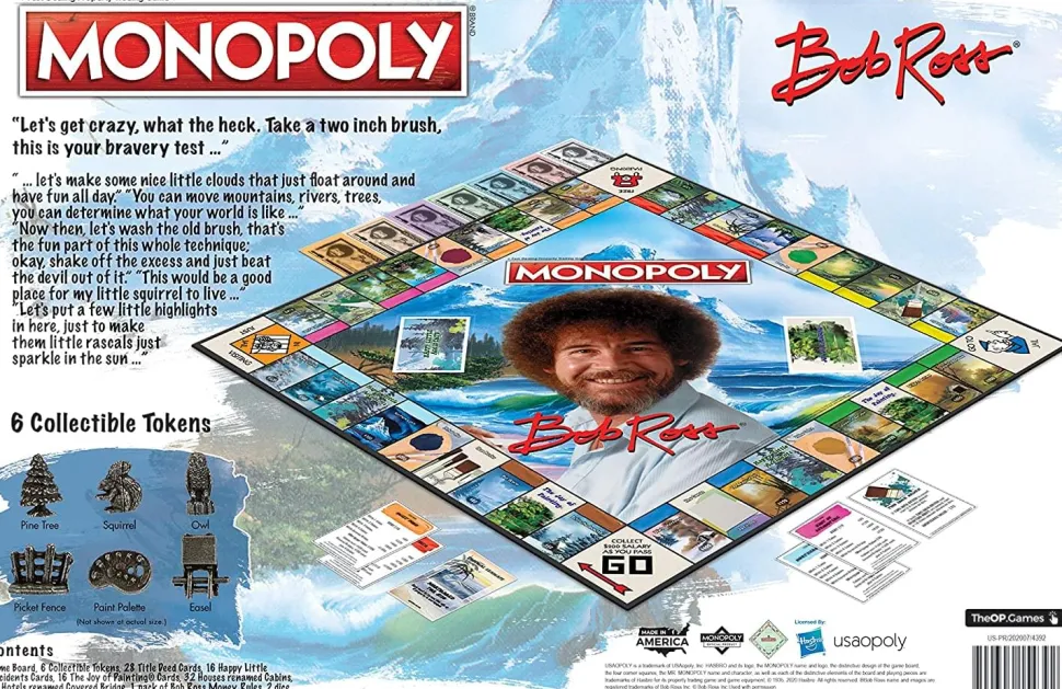 “Take advantage of whatever happens†in the most peaceful edition of MONOPOLY you’ve ever seen! MONOPOLY: Bob Ross is your bravery test to buy, sell, and trade favorite works of art from The Joy of Painting series. Use collectible tokens to canvas the board as a Squirrel, Pine Tree, Easel, and more as you build up Cabins and Covered Bridges, shake off taxes, and beat the devil out of others’ budgets to be the last one standing with Happy Bucks!