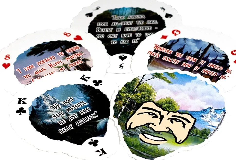Happy cards! Discover Bob Ross and his Joy of Painting with this officially licensed deck of die cut shaped playing cards featuring 54 of his paintings and quotes. Playing cards are great for all types of card games, including Poker, Bridge, Go Fish, Hearts, Blackjack, and more!
