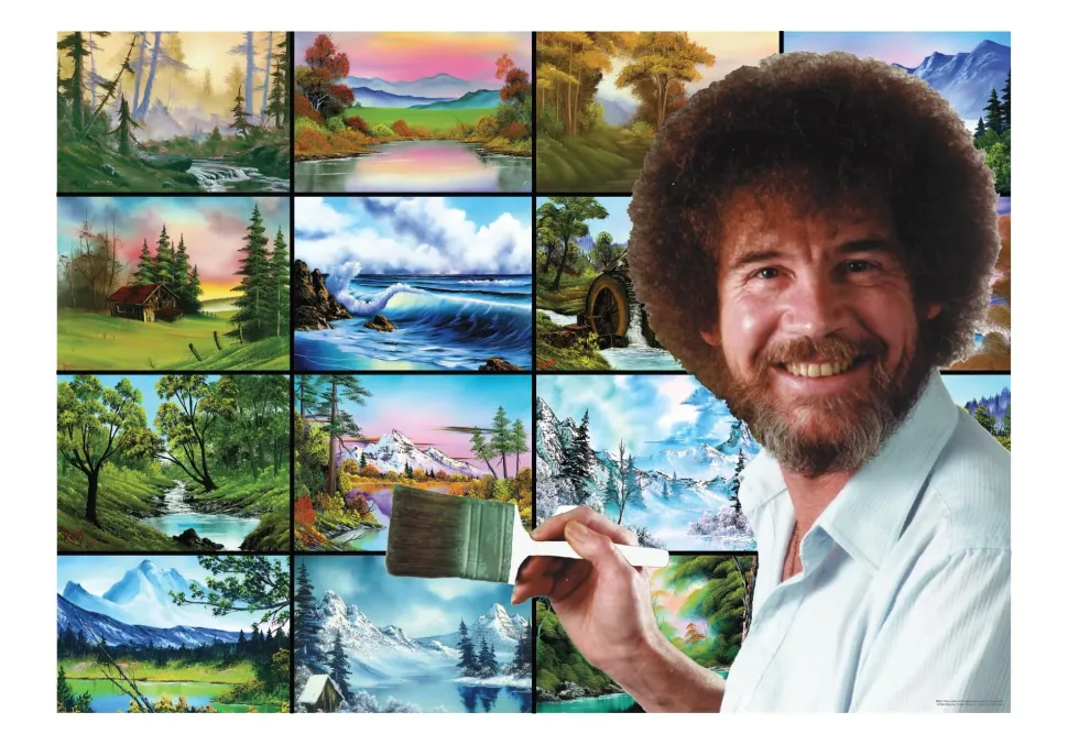 Unlock the joy of painting with this Bob Ross These Things Live Right In Your Brush 1000-Piece Puzzle. Measuring 28 x 20 inches, the completed jigsaw puzzle depicts Bob Ross holding up a paintbrush with his signature look, including his iconic permed hairdo and a collared shirt. Featured in the backdrop is a 16-piece collage that shows off some of his famous nature paintings. A variety of scenic landscapes are depicted in the collage of images, from oceans and lakes to forests and mountains. His iconic “happy little clouds” and “happy little trees” are present throughout each of the paintings, which can be revealed piece by piece as you assemble the puzzle.