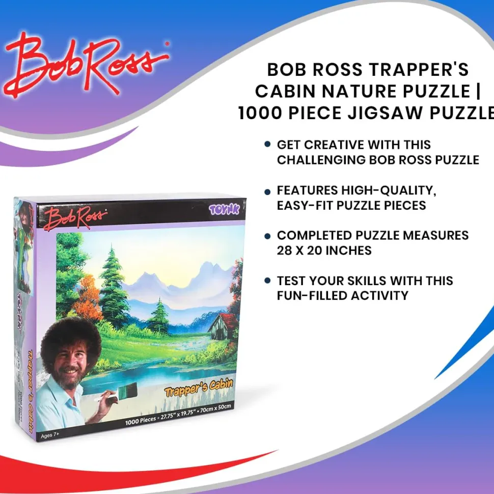 Unlock the joy of painting with this Bob Ross Trapper’s Cabin 1000-Piece Puzzle, featuring the beautiful artwork of the inspirational painter. Measuring 28 x 20 inches, the completed jigsaw puzzle depicts a rustic cabin near a lake in the quiet countryside. In the backdrop of the scenic landscape is a forested area and “almighty mountains,” adding perspective to the iconic design. The peaceful setting offers soothing imagery as you assemble the puzzle, providing a sense of calm and relaxation.
