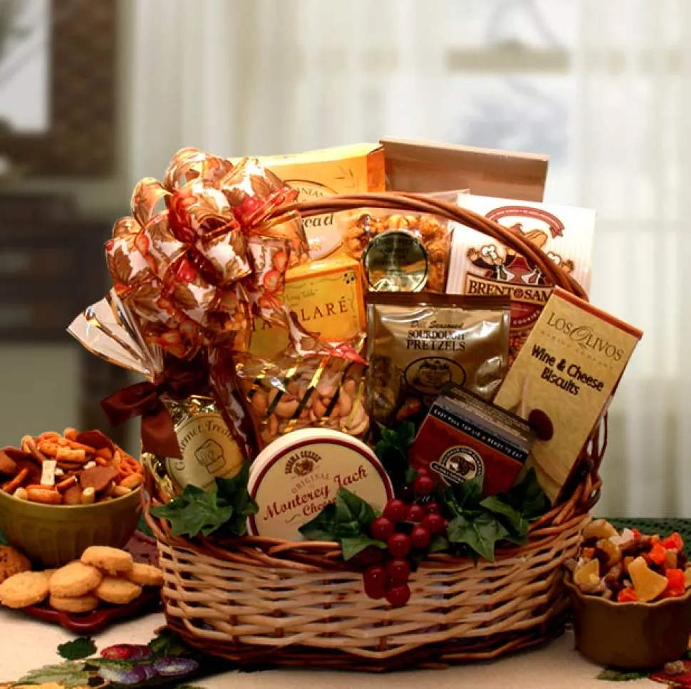 A sumptuous gift basket made of hand-woven natural willow in two tones. Brimming with an abundance of savories and sweets like Tavolare sweet-n-salty snack mix, Monterey Jack cheese spread, Los Olivos Wine & Cheese Biscuits, Parmesan flatbread crisp crackers, deluxe mixed nuts, Dill seasoned pretzel nuggets, chocolates and much more!