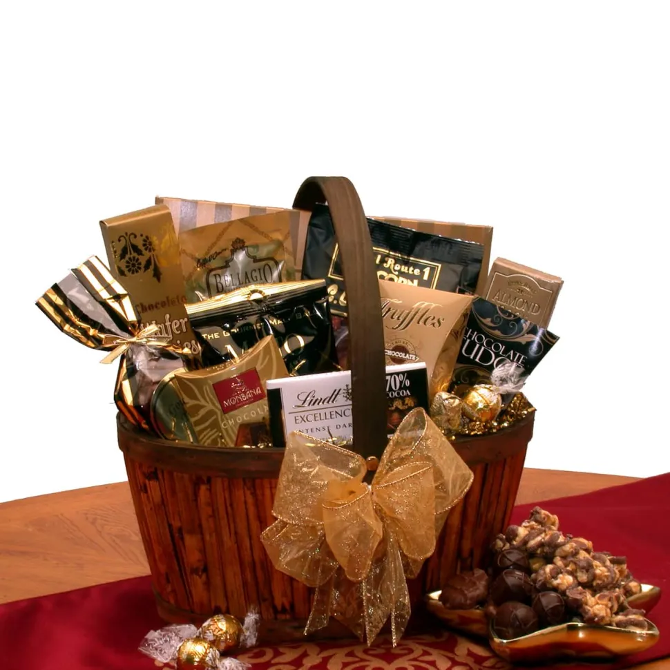 This gift basket includes: 9 oz Assorted chocolates, Belgian Truffles 1.2 oz, Chocolate Fudge 1.8 oz, Almond Roca 1.4 oz, Chocolate Fudge popcorn, Lindt Chocolate Bar, Monbana Truffles, Chocolate covered nuts 1.8 oz, Chocolate cream wafer cookies 6 oz, Bellagio chocolate cappuccino, Malta Bella Chocolate toffee. Lindt Truffle ball, and finished with a hand-tied shimmering gold bow.