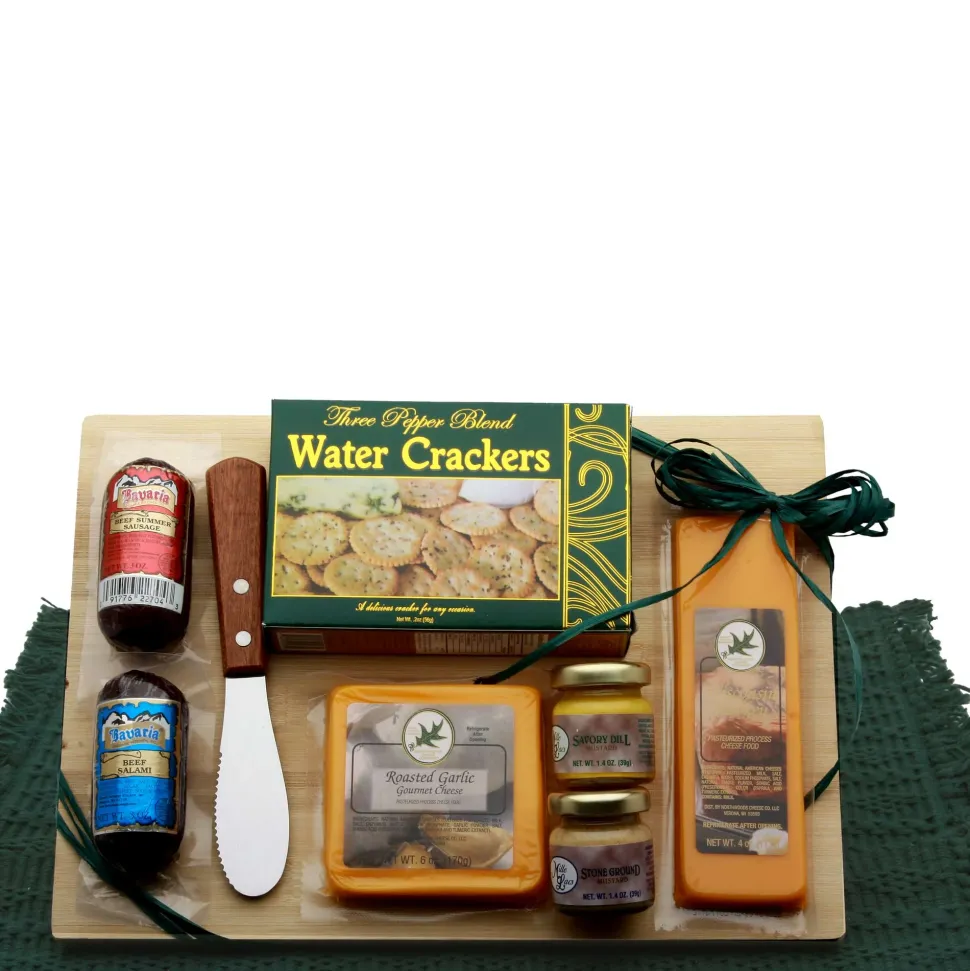 The Classic Selections Meat & Cheese Charcuterie Board includes: 5 oz. Bavarian Summer sausage, 5 oz. Bavarian Summer Salami, 2 oz. three pepper water crackers, 6 oz. Roasted garlic Wisconsin Cheddar square, 4 oz. Smokey Wisconsin cheddar bar, wooden handle slicer and spreader, 1.4 oz. savory dill mustard, 1.4 oz. champagne mustard on a solid bamboo cutting board measuring 12×10, wrapped in cellophane and completed with a raffia bow.