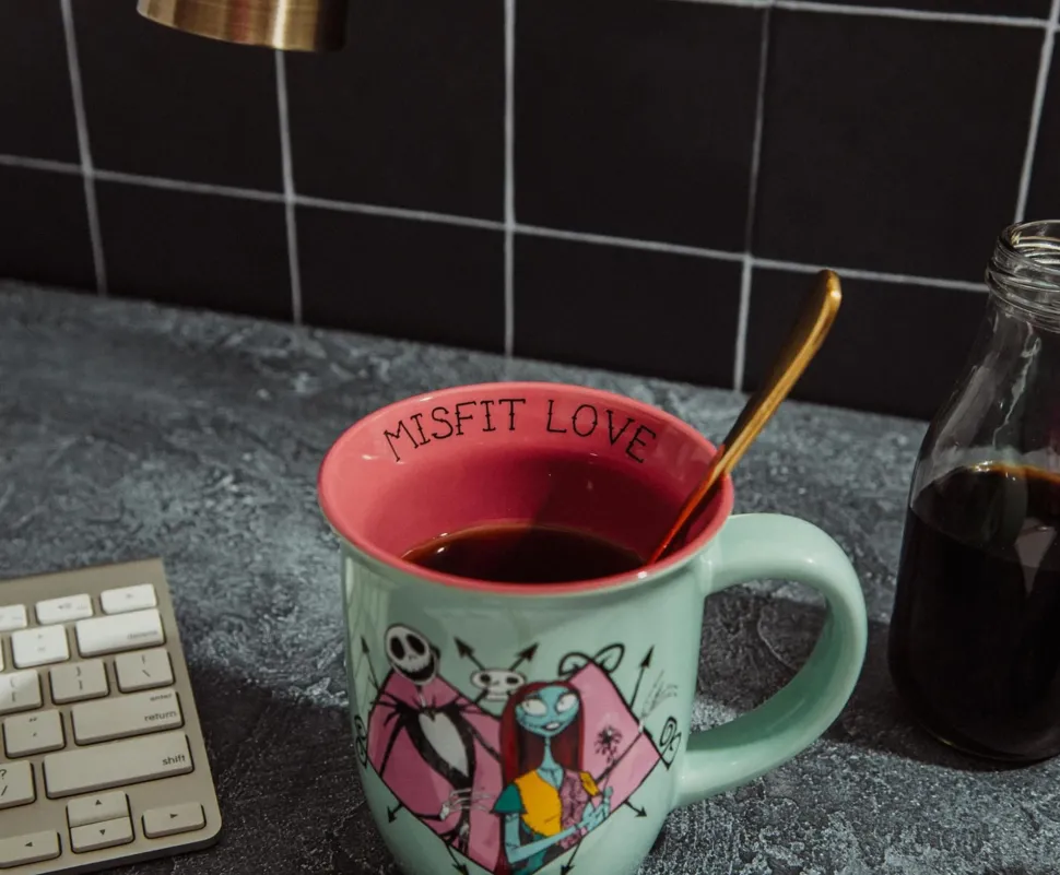 Show off your love of The Nightmare Before Christmas with this quality mug! Blue mug with pink rim and interior features Jack Skellington and Sally. The words “Misfit Love” are printed on the rim. Wide drinking rim with comfortable handle grip. Perfect for hot or cold beverages and keeps a consistent temperature. Produced by Silver Buffalo, a trendsetting housewares and home decor company based in the heart of New York City.