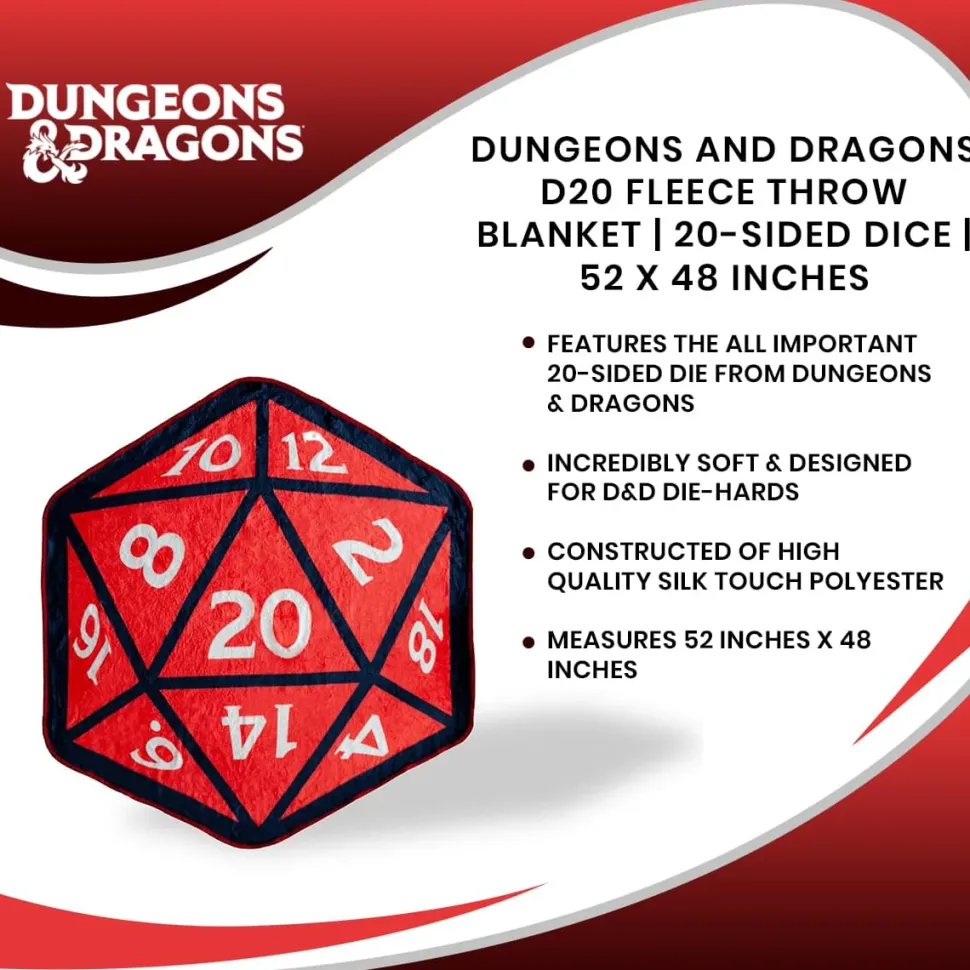 Let your environment speak for you when it comes to your personal likes and interests in gaming by filling your home with the things you love! What better way to add a touch of your personal favorites than with a uniquely designed plush D20 Dungeons And Dragons blanket? Fleece blankets and throws offer a wonderfully warm and unique touch to your furniture, bedroom, and more! Each of these soft blankets is designed to bring your fandom to life! Decorate your chairs and couches with these throw blankets or create a unique room design with throw blankets for bedroom decor! Officially licensed, this soft blanket is crafted from 100% polyester and is designed to be the ultimate addition to any collection of Dungeons and Dragons bedding! Grab this soft fleece throw blanket for yourself or the D&D fan in your life today!
