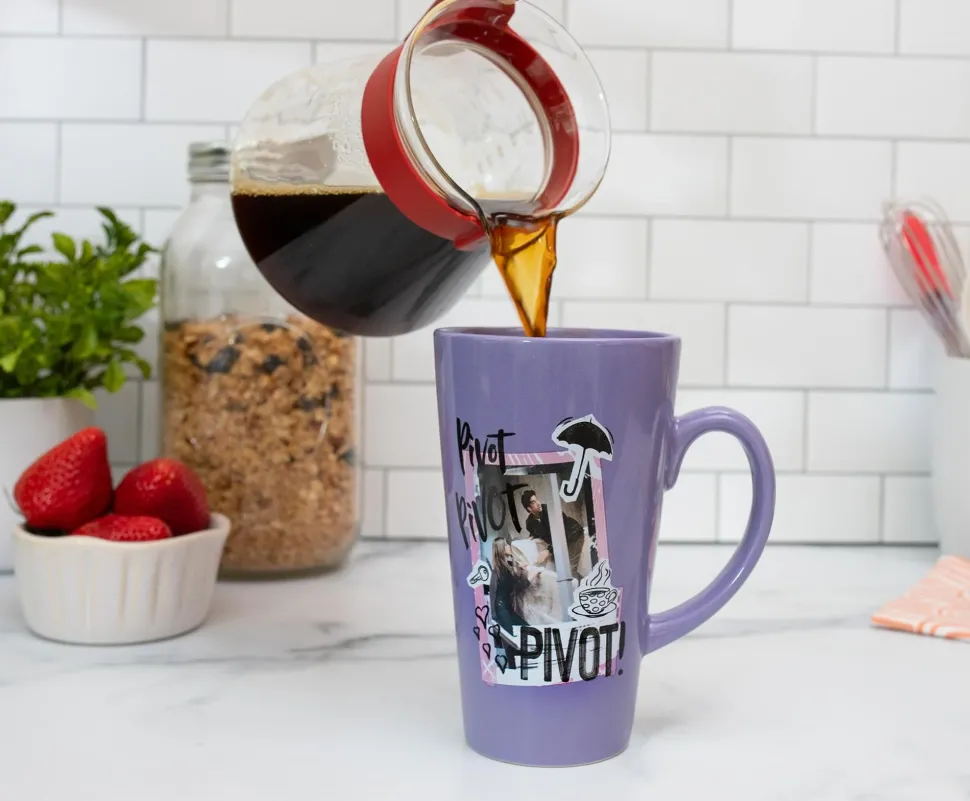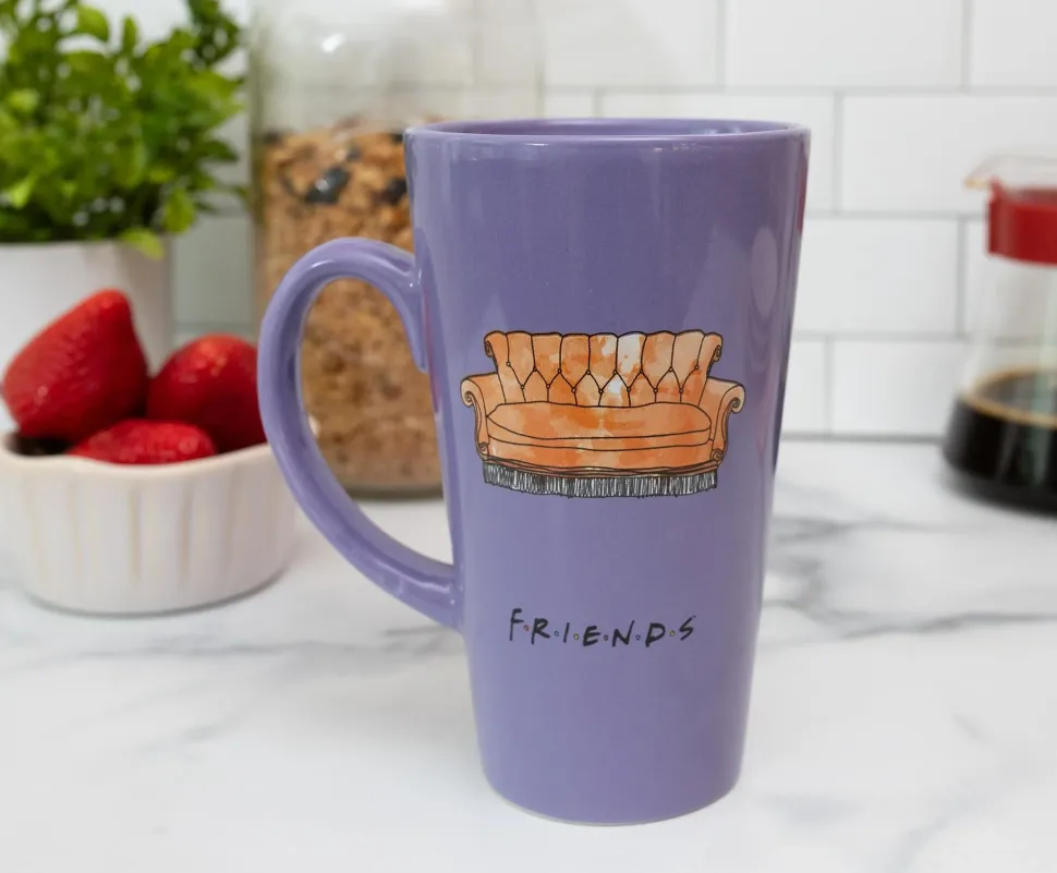 Based on the classic Friends episode, “The One with the Cop,” this lavender latte mug features Ross and Rachel struggling to move a couch. Reading the iconic line, “Pivot, Pivot, Pivot!” this mug captures the hilarious scene in all its glory. Charming cartoon icons, the signature Central Perk sofa, and the Friends logo complete the nostalgic throwback.
