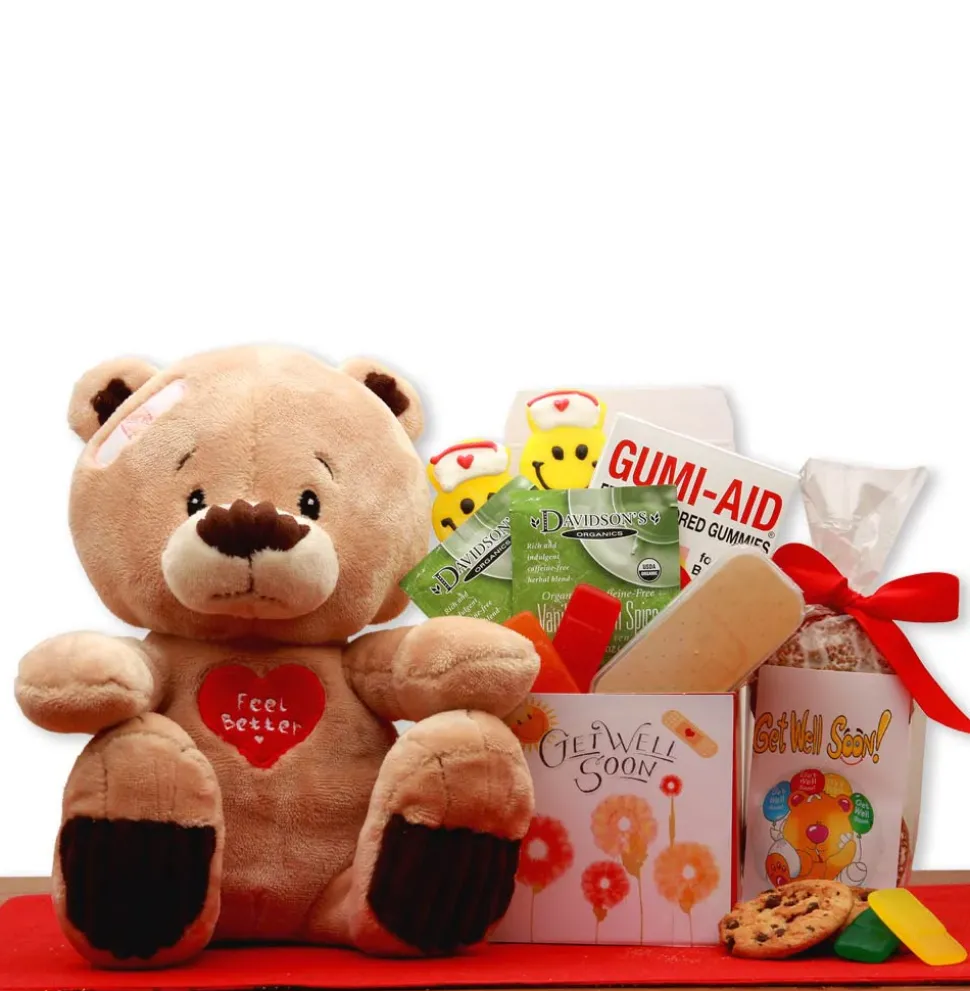Our Get Well Soon Teddy Bear Gift Set includes: 14″ ultra Plush Get Well teddy bear, Get well gift box filled with, Get well chocolate chip cookies, Get well soon gummi Band-Aids in fruit flavors, 2 Herbal teas, two frosted smile pops, bandage shaped playing cards.