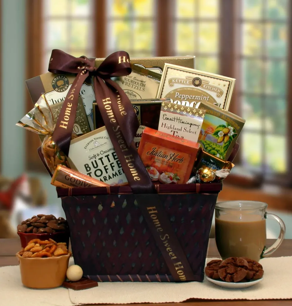 The Home Is Where The Heart Is Housewarming Gift Basket includes: chocolate salted caramel cookies, butterscotch candies, kettle popcorn, Highland select tea, smoked almonds, Italian herb creamy cheese dip, Ghirardelli chocolate square, Lindor white chocolate truffle ball, Lady Everton butter toffee caramels, Godiva classic milk chocolate bar, snack mix, cappuccino, hot fudge brownie sourdough Bavarian style pretzel dipping sticks a dark stain classic wood chip basket. This gift measures 12″ long by 9″ wide by 13″ tall, weighs 4 pounds, is wrapped in cellophane and is topped with a custom hand made welcome home sash and bow.