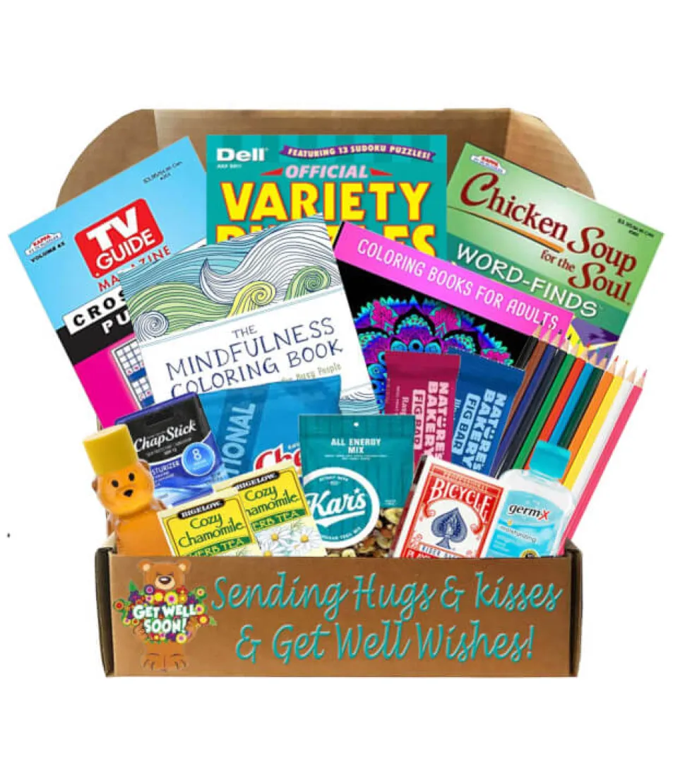 Our Hugs & Kisses Get Well Care Package includes: Chamomile tea, wildflower honey, Kars energy trail mix, Fruit & Fig raspberry energy bar, Fruit & Fig blueberry bar, chex mix, Chap stick, Bicycle playing cards, Germex hand sanitizer, The mindfulness coloring book with over 75 pages of anti-stress coloring, Mandala Mazes coloring book for stress reducing coloring, 12 piece artists coloring pencils, Chicken soup for the soul word find book, Variety puzzle book, and TV Guides Crossword.