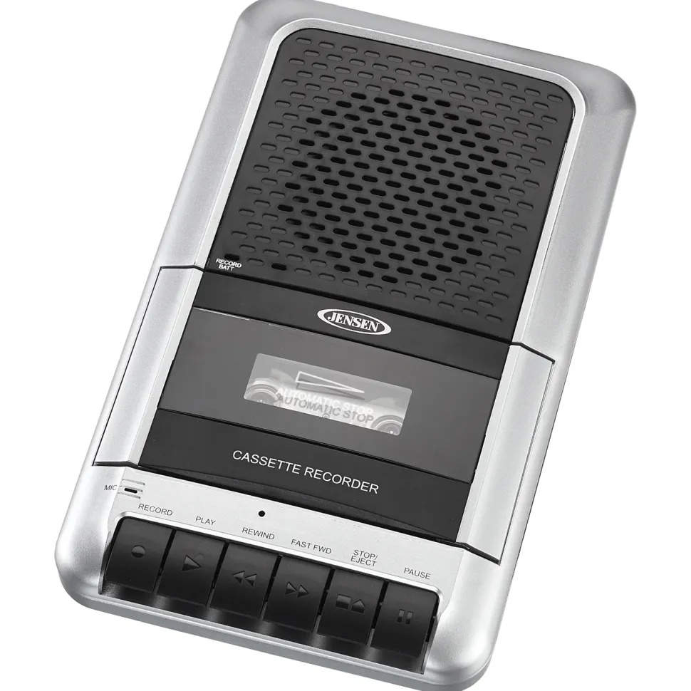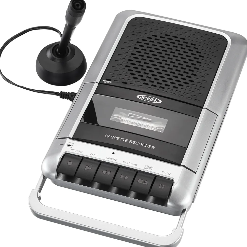 JENSEN® brings back an old favorite with the MCR-100 “shoebox” style Cassette Player/Recorder. The unit includes a top loading cassette deck that both plays and records along with a retractable carrying handle for taking it with you! The unit features easy to use buttons, a one-touch record button, and an automatic voice level control. You can record using the built-in microphone or the included external microphone with handy desk stand. A headphone jack is included for private listening, and you can attach other players to the unit using the auxiliary line-in jack. The MCR-100 operates on four (4) x “C” size batteries (not included) or with the AC adaptor (included).