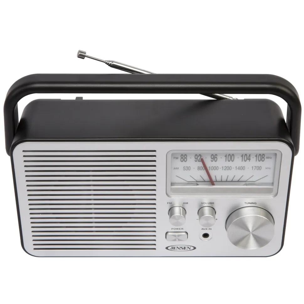 Never miss your favorite game, listening to your favorite radio station or catch up on the latest news with the JENSEN® MR-750 portable AM/FM radio. The radio can go anywhere you go and is available in three stylish colors with a large analog tuning dial that makes setting your favorite station a breeze. You can also play music from an MP3 or other digital media player using the front mounted auxiliary input jack. The MR-750 also includes a built-in speaker, folding handle and FM telescopic antenna. The unit operates on 120V AC power or using four (4) x “C” batteries (Not included).