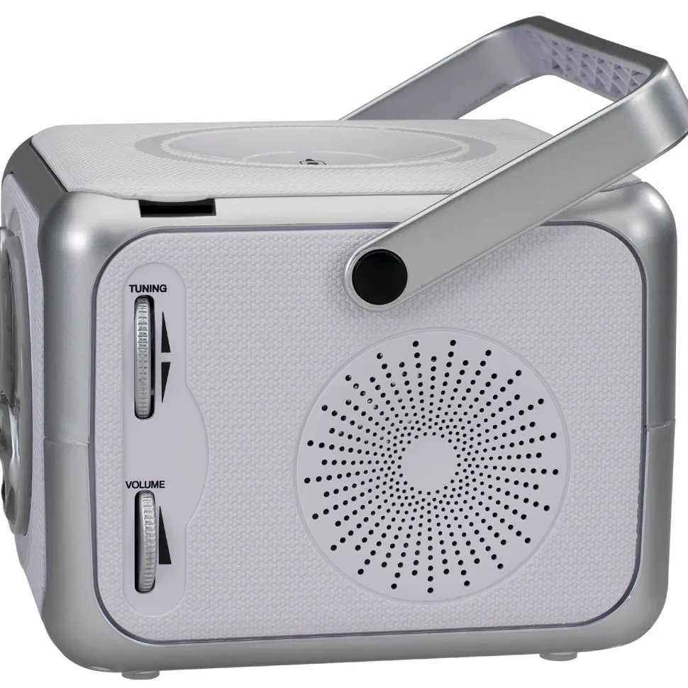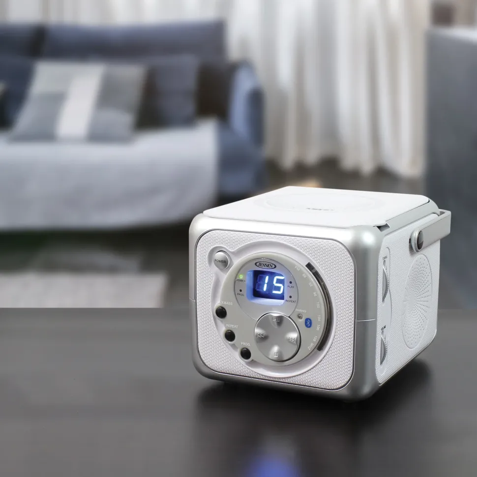 Experience great music with the JENSEN® CD-555, a compact portable stereo music system with Bluetooth® connectivity, a top loading CD player that plays CD-R/RW discs and FM radio. Link up your Bluetooth device, and wirelessly play your music from up to 33 feet away. The unit features easy access front and side mounted controls and an X-Bass button for enhancing the bass effect on anything you play. The CD player features a blue LED track display and all the necessary controls for playing and enjoying your CDs. The unit also has a foldable carrying handle, headphone jack, and auxiliary line-in jack for connecting your iPod®, MP3, or other digital audio player. Enjoy powerful, realistic sound anywhere you go with this portable music system.