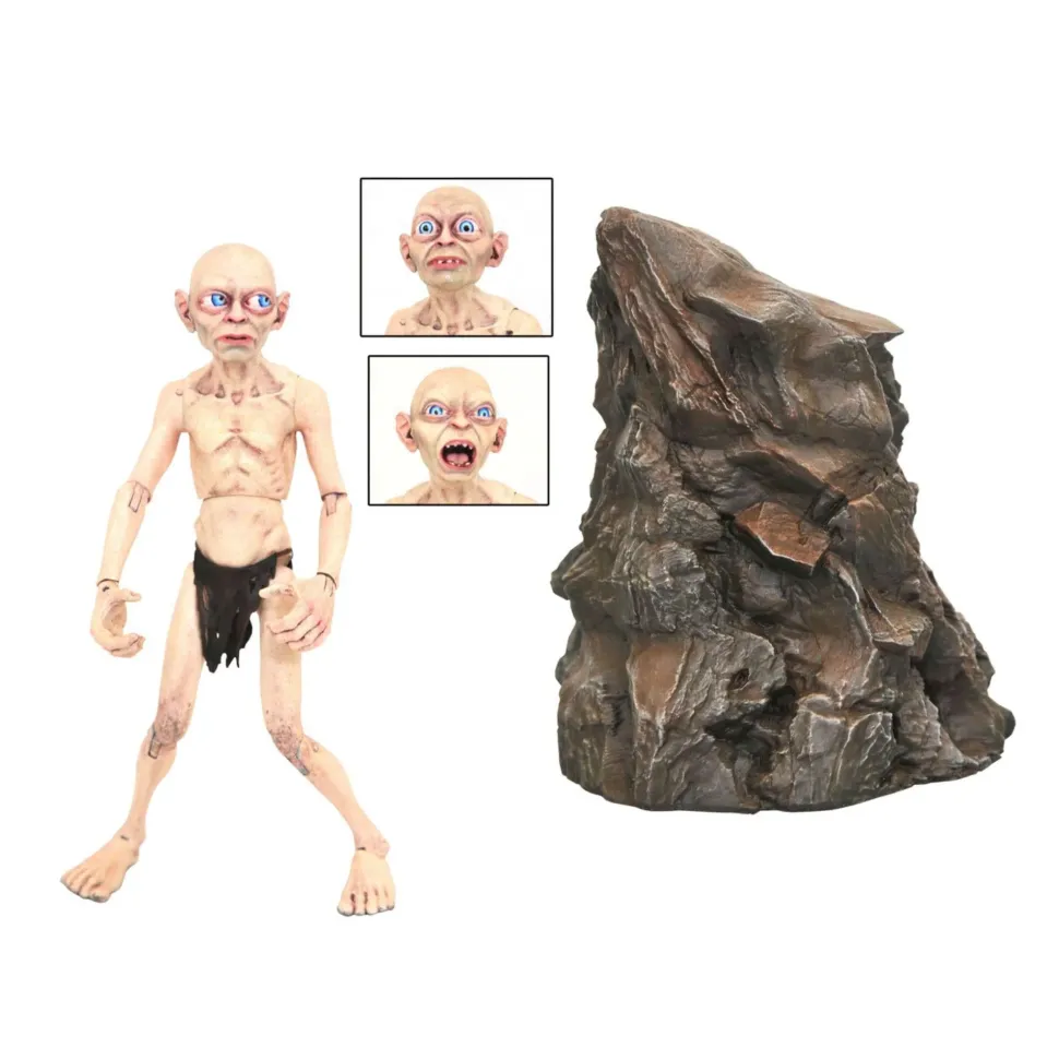 A Diamond Select Toys release! Gollum gets the deluxe treatment in this new action figure release! Based on his appearance in the Lord of the Rings trilogy, Gollum comes packaged with three interchangeable heads, interchangeable hands, a rock formation to climb and perch on, plus other bonus character accessories, including a fish, an axe for Gimli, and knives for Legolas and Aragorn! Gollum features 16 points of articulation, detailed sculpting and paint, and comes packaged in a full-color window box. Designed by Eamon O’Donoghue, sculpted by Gentle Giant Studios!