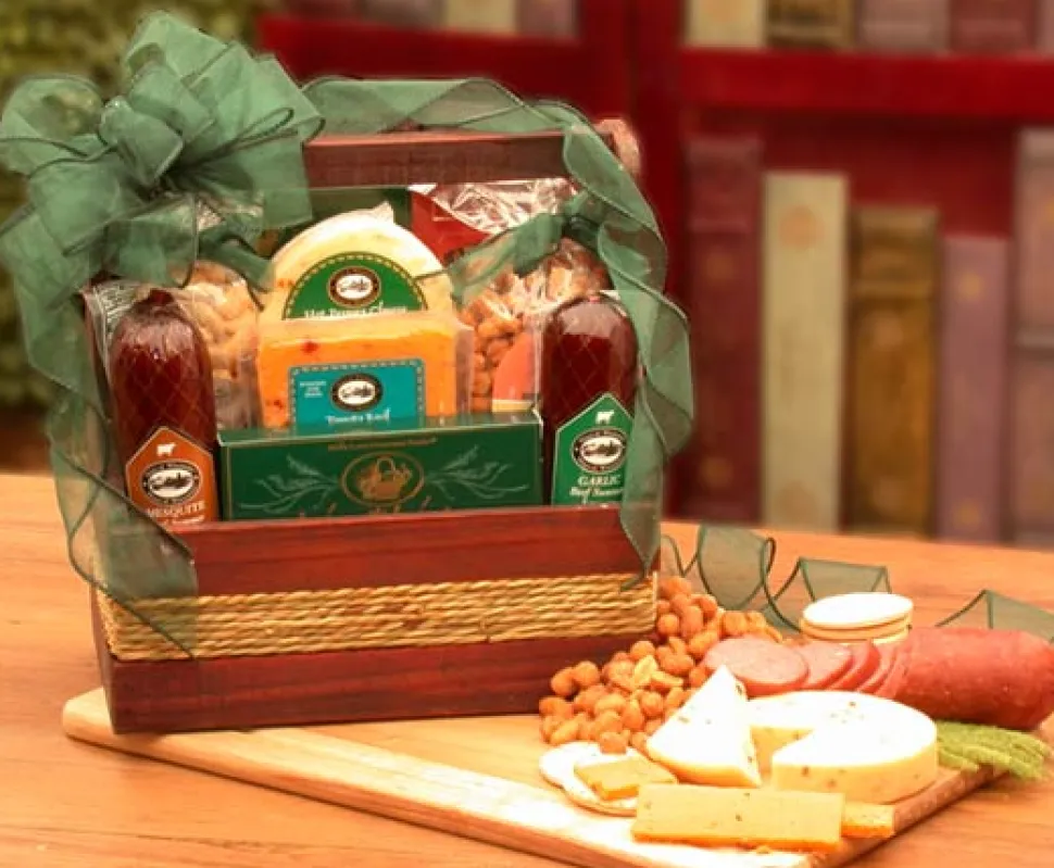 Your manly man will enjoy the truly manly snacks and gourmet treats in the Sausage and Nut Tote gift basket. Meats and cheeses galore and a variety of nuts will tempt his taste buds. The lovely wooden gift tote will last long after all the treats have disappeared. Send your manly man this sausage and nut gift basket!