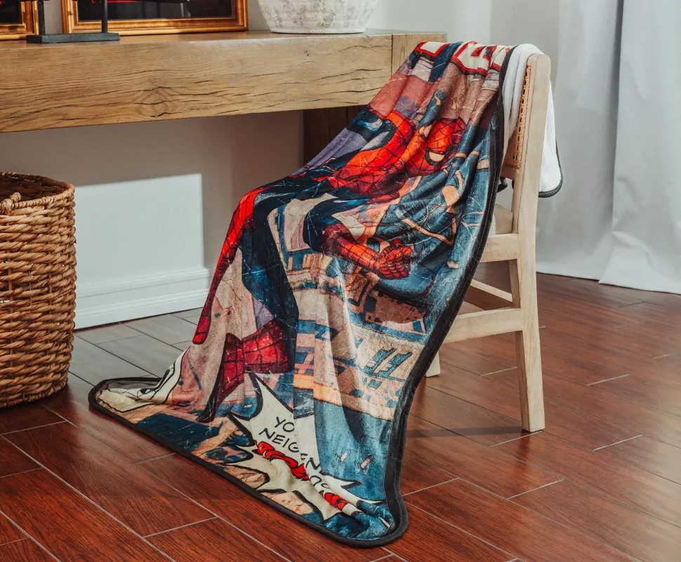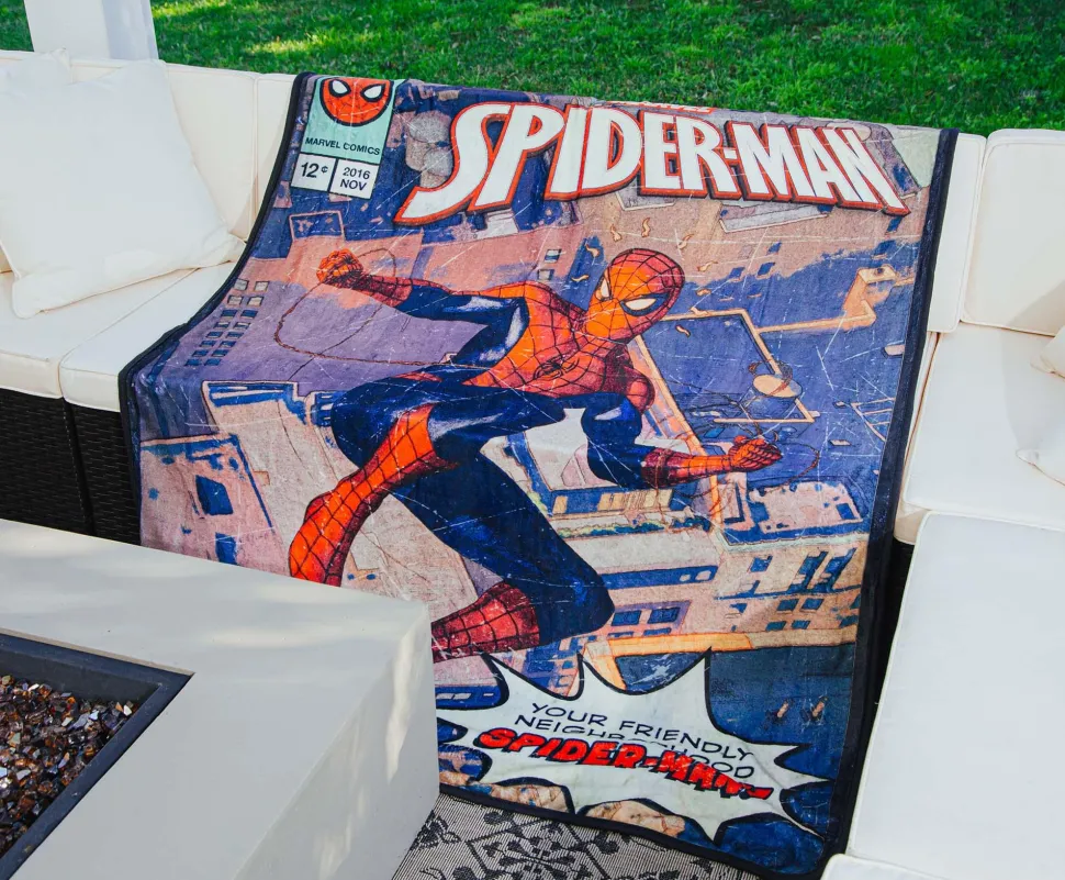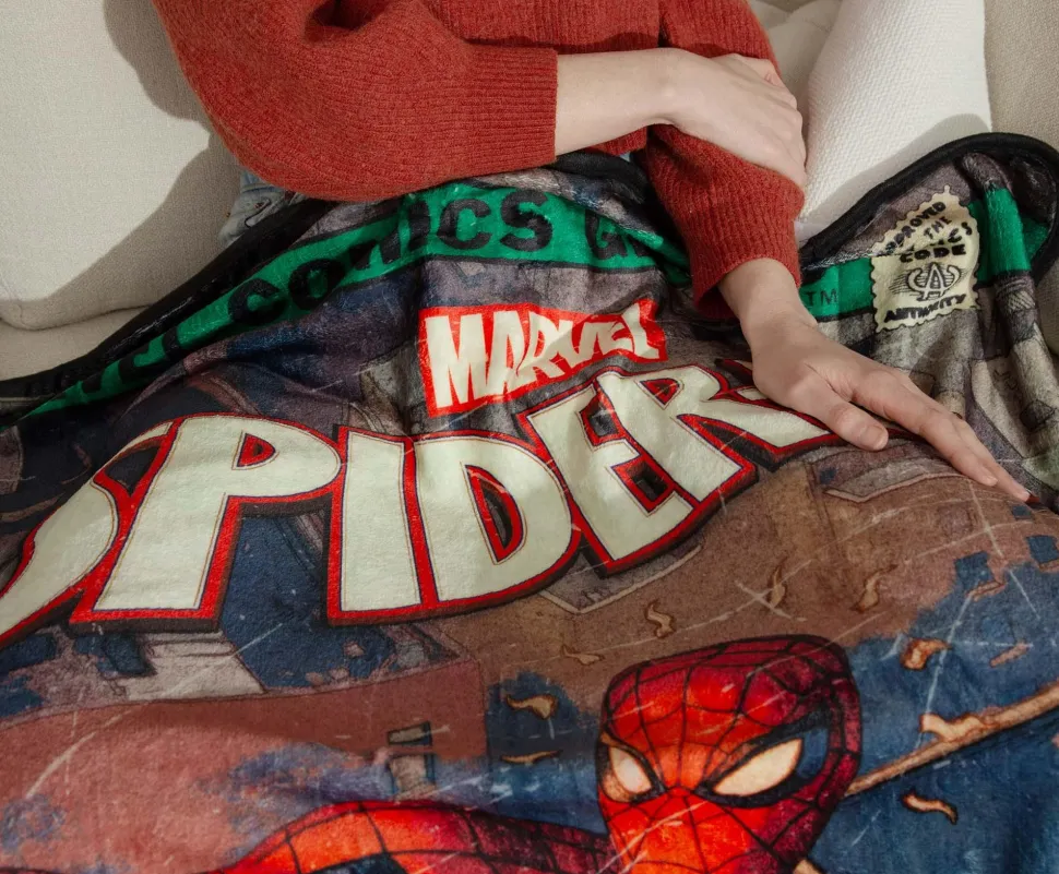 Snuggle senses are tingling! Swing into cozy comfort with this exclusive Spider-Man throw blanket inspired by the action-packed pages of Marvel Comics.