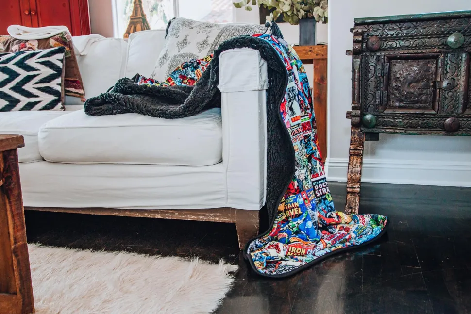 Measuring a roomy 54 x 72 inches, the oversized design means you can easily wrap yourself up in this fleece blanket or even place it around your shoulders like a caped hero of snuggles. Easy to accessorize with your living space, you can stylishly drape this sherpa blanket anywhere that could use an extra cozy touch or decorative accent. Perfect for everyday use, this Marvel Comics Throw Blanket is machine-washable and easy to clean. Machine wash with cold water is highly recommended.