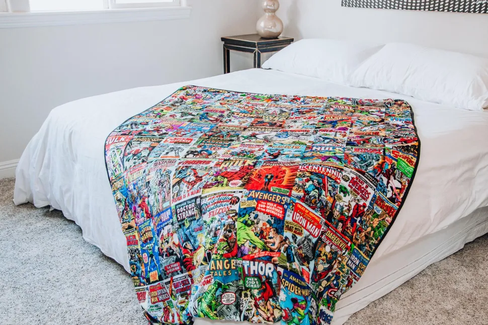 Calling all Marvel fans! Show off your love of superheroes with this super comfy Marvel Comics Throw Blanket. Authentically designed, this fandom-themed blanket features a vibrant collage of 72 different classic Marvel comic book covers. Popular superheroes are featured in the design, including Captain America, Iron Man, Spider-Man, and many other fan-favorite characters.