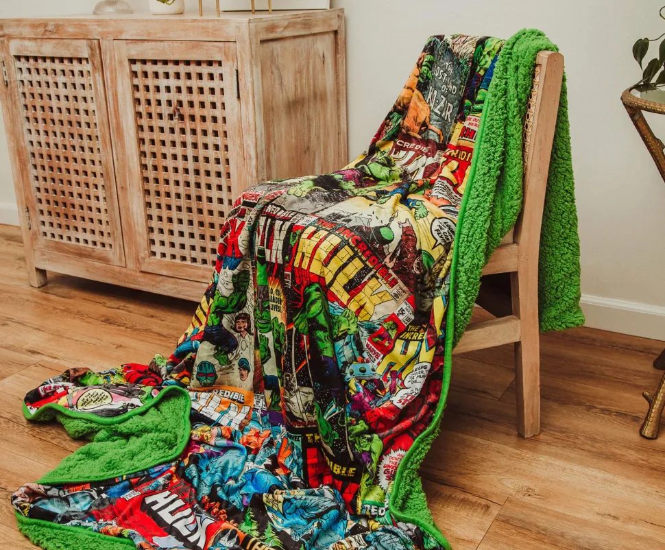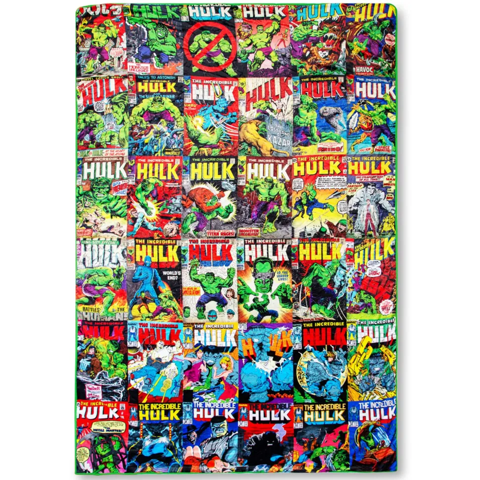 Calm your rage by snuggling up in this exclusive Marvel Hulk Comic Book Throw Blanket. Ever since the towering, muscle-bound hero debuted in 1962, the Hulk has become one of the most recognizable superheroes the world has ever known. This oversized fleece blanket pays tribute to his long and decorated history in Marvel Comics.