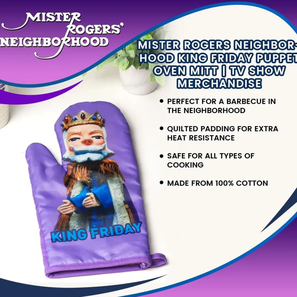 Show off your love for the hit TV show Mr Rogers, with these amazing Mister Roger neighborhood King Friday oven mitts. This exclusive Mr Rogers merchandise features the character of King Friday on a bold purple background. They are made with 100% quilted cotton, the quality of this Mr Roger puppet oven mitt is amazing and durable. Because of the good material used to construct this Mr Rogers neighborhood collectible, you can use it for all kinds of cooking, even BBQ! The Mr Rogers merchandise is an officially licensed product. It makes the perfect gift for your friends who love this classic TV show.