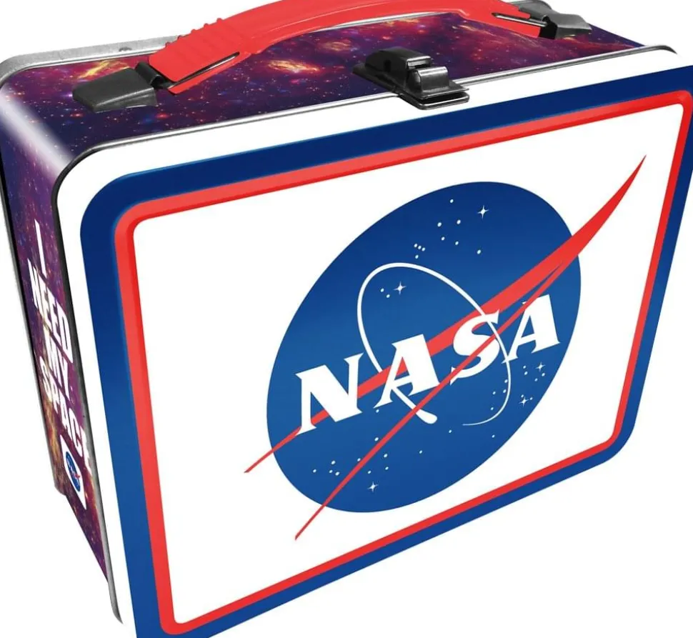 Show off your love of NASA with this quality tin lunch box! 8.65 x 6.75 x 4- inch lunchbox features an embossed front lid with NASA’s classic “meatball” insignia. Great for using around the house, at the office, parties, and more! Makes a great gift idea.