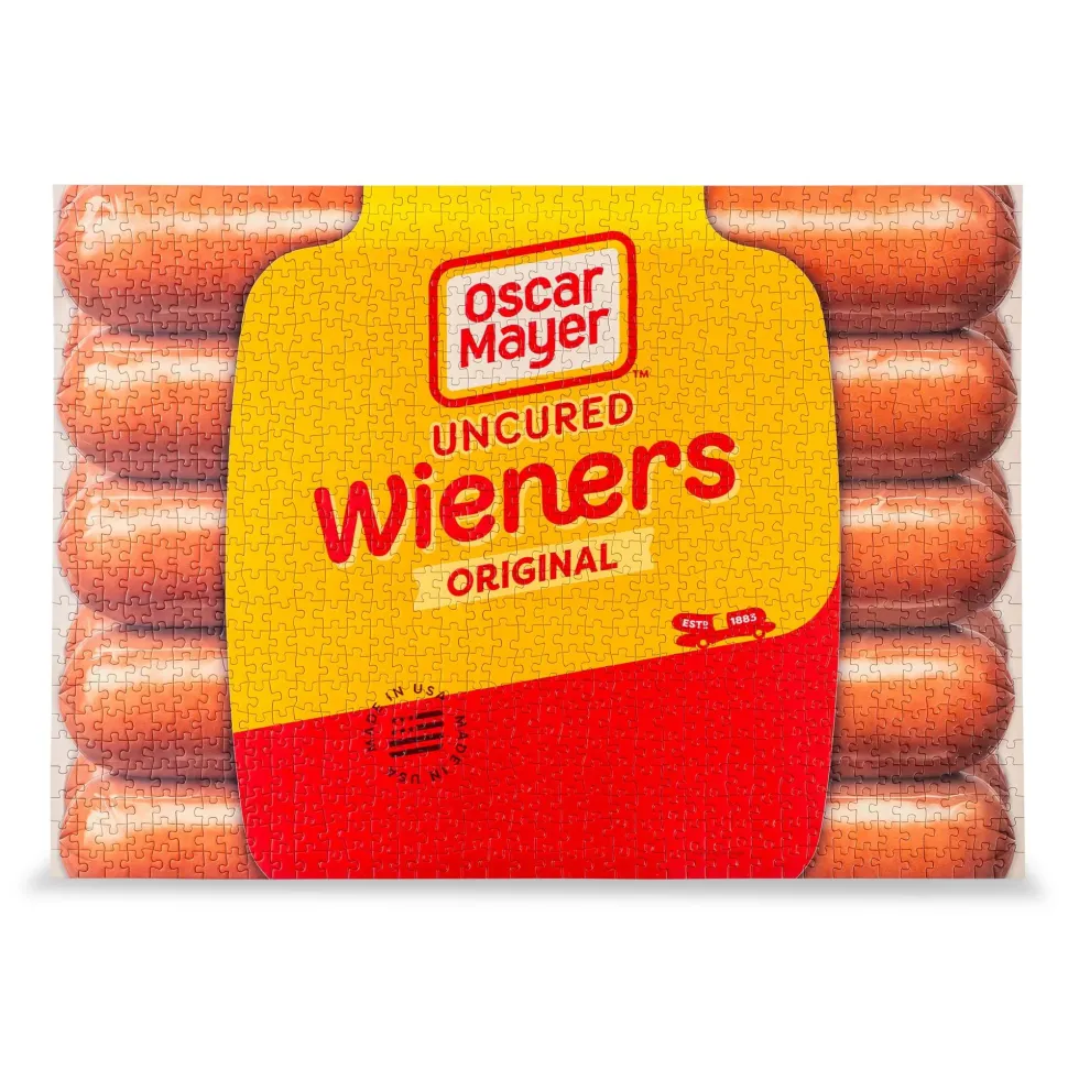 Snap into action assembling this stimulating puzzle featuring Oscar Mayer’s original uncured wieners. Each piece you place recreates the golden yellow and red packaging for the popular bunned cuisine. No detail has been overlooked in the mouth-watering design, from the classic company logo to the “Made in the USA” stamp.