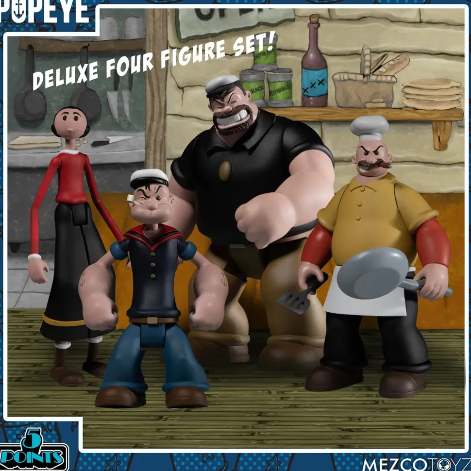 Ah ga ga ga! This titanic boxed set features Popeye, Olive Oyl, Bluto, Rough House, and a playset – talk about a whale of a time! Once assembled, Rough House’s Cafe features all the familiar details as seen in the nostalgic comic strips. THE 5 POINTS POPEYE: DELUXE BOXED SET INCLUDES: Popeye – Known for his constant muttering, squinting, and superhuman strength after gulping down a can of spinach, Popeye will do whatever it takes to rescue his beloved Olive Oyl from the wicked hands of Bluto. Popeye comes with a spinach can that he can hold and two pairs of interchangeable arms. Olive Oyl – the poster girl for “damsel in distressâ€, Olive Oyl is Popeye’s eternal sweetheart. The two have stuck together through thick and thin. Bluto – the brutish arch-rival of Popeye, Bluto is always trying to get rid of Popeye or strike it rich. Bluto has a devious attraction towards Olive Oyl and usually attempts to make her his conquest. Bluto comes with two pairs of interchangeable arms. Rough House – a hard working chef and owner of Rough House’s Café, offering hamburgers and advice to those in need. Rough House comes with a spatula and a frying pan that he can hold. Rough House’s Café – owned and operated by Rough House himself, this greasy spoon is the local hotspot for Popeye and his pals. ACCESSORIES: Two (2) pairs of interchangeable arms for Popeye Two (2) pairs of interchangeable arms for Bluto One (1) can of spinach One (1) spatula One (1) frying pan Four (4) display bases 5 Points are Mezco’s upgrade to the articulated action figures of yesteryear. These highly detailed, poseable action figures feature some of pop culture’s most familiar faces, both old and new.
