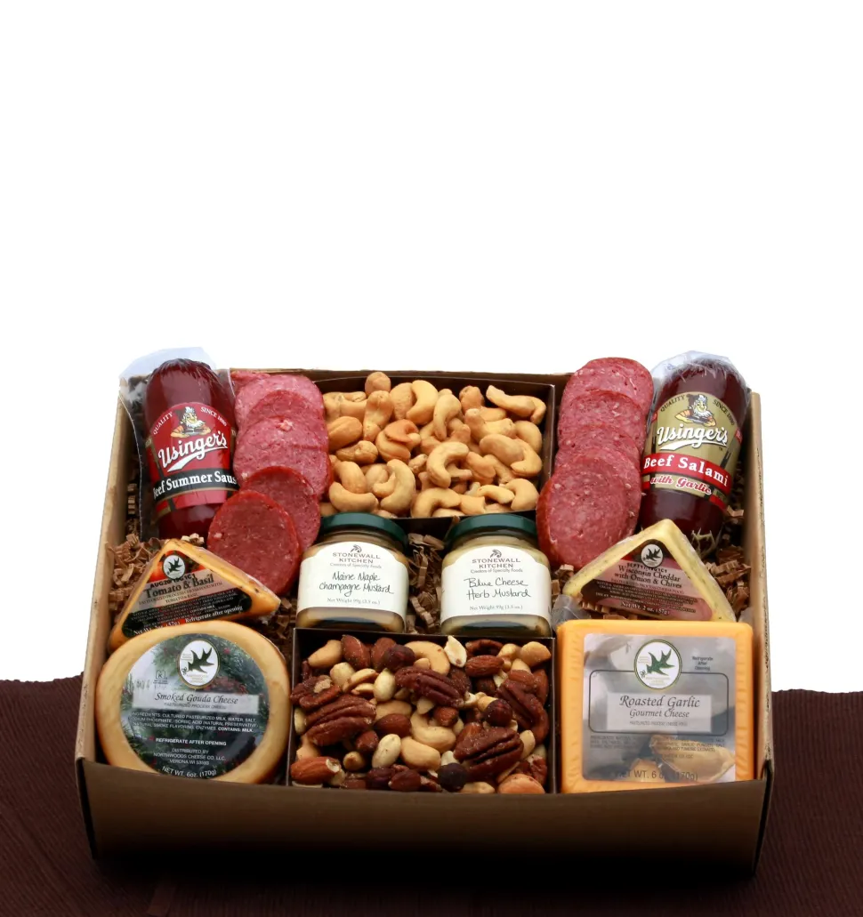 Savory Favorites Gift Box includes: Usinger’s 5 oz. Beef Summer sausage, Usinger’s Beef salami with garlic, 2 oz. Tomato basil cheese triangle, 2 oz. Wisconsin White cheddar with garlic and onions triangle, 3.5 oz. Blue cheese herb mustard, 3.5 oz. Maple Maine champagne mustard, 3 oz. Salted cashews, 3 oz. Salted deluxe mixed nuts, 6 oz. Smoked gouda cheese round, 6 oz. Roasted garlic cheddar cheese square. Comes in a tan gift box measuring 12 x 9, is wrapped in cellophane and topped with a handmade natural raffia bow.