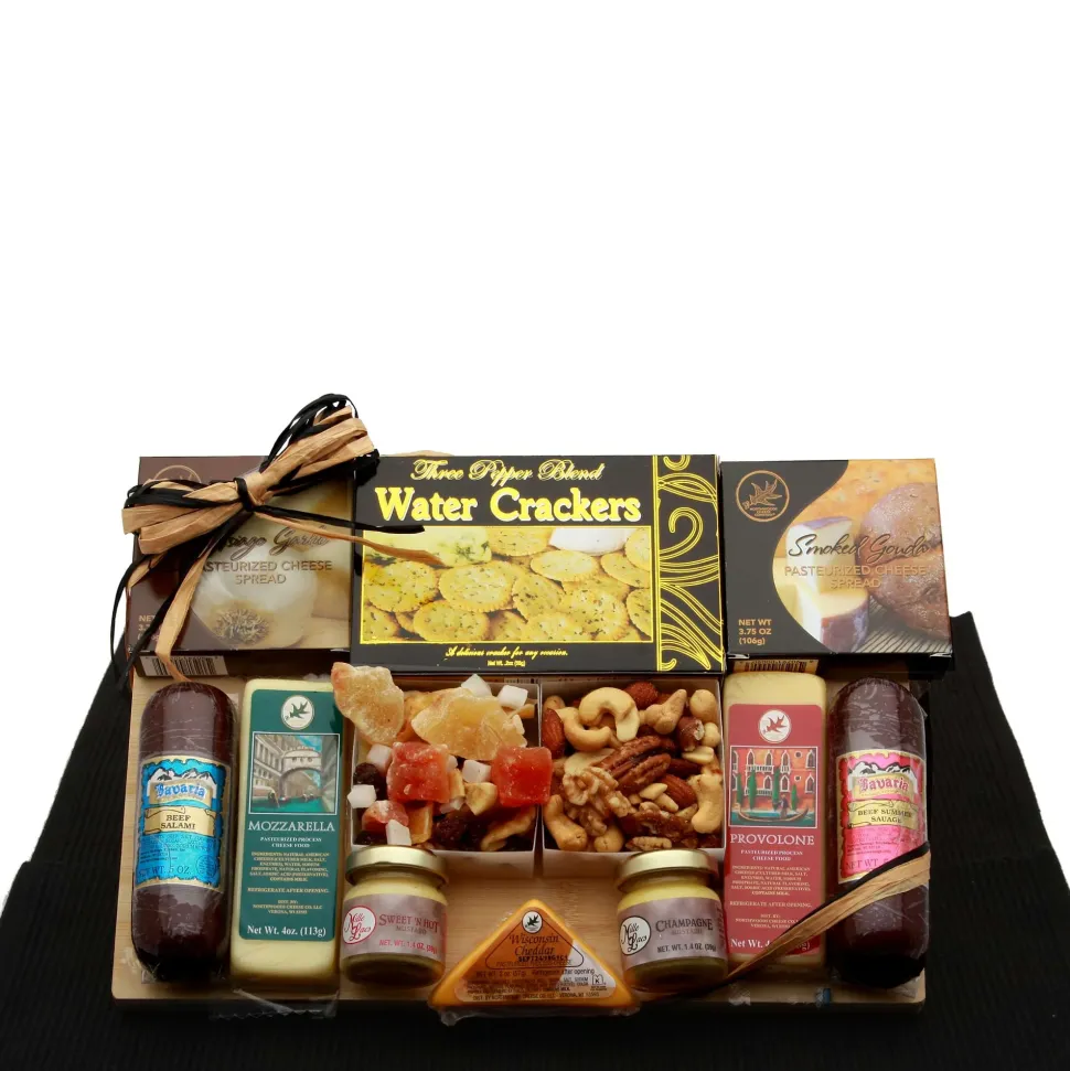 Savory Selections Meat & Cheese Gourmet Gift Board includes: 5 oz. Bavarian Summer sausage, 5 oz. Bavarian Summer Salami, 2 oz. Three Pepper water crackers, 3 oz. Tropical trail mix, 3 oz. Deluxe mixed nuts, 1.4 oz. Sweet N Hot Mustard, 1.4 oz. Champagne Mustard, 4 oz. Provolone cheese bar, 4 oz. Mozzarella bar, 2 oz. Wisconsin cheddar triangle, 3.75 oz. Smoked Gouda cheese spread, 3.75 oz. Asiago garlic cheese spread, on a solid bamboo cutting board measuring 12×10. This gift comes wrapped in cellophane and completed with a raffia bow.