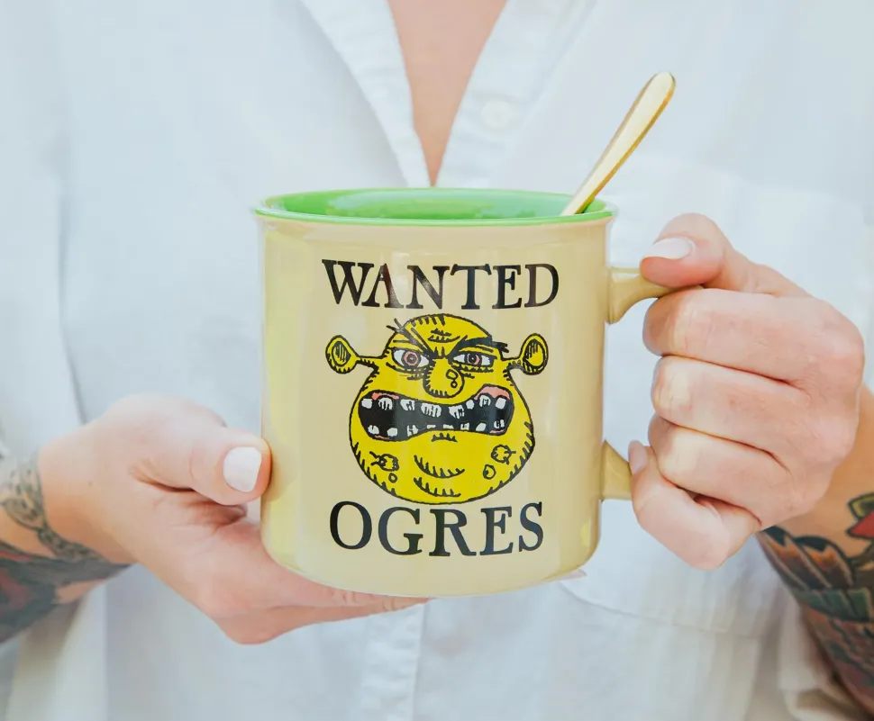 This mug depicts one of Lord Farquaad’s outlandish wanted posters. Reading “Ogres Wanted,” the illustration shows an exaggerated, menacing portrait of the gentle giant Shrek. With its ogre-green interior and large loop handle, you’ll always remember what makes Shrek so special.