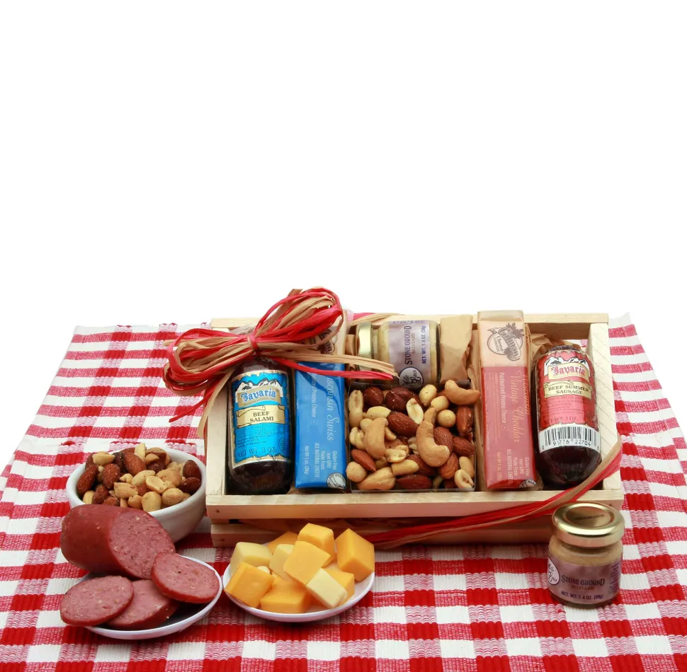 Signature Sampler Meat & Cheese Snack Set includes: 5 oz. Bavarian Summer sausage, 5 oz. Bavarian Summer Salami, 1 oz. White cheddar cheese bar, 1 oz. Swiss cheese bar, 1.4 oz. Stone ground mustard, 2 oz. Deluxe mixed nuts, and Solid pine crate. This gift comes in a solid pine crate, wrapped in cellophane and topped with a handmade natural raffia bow.