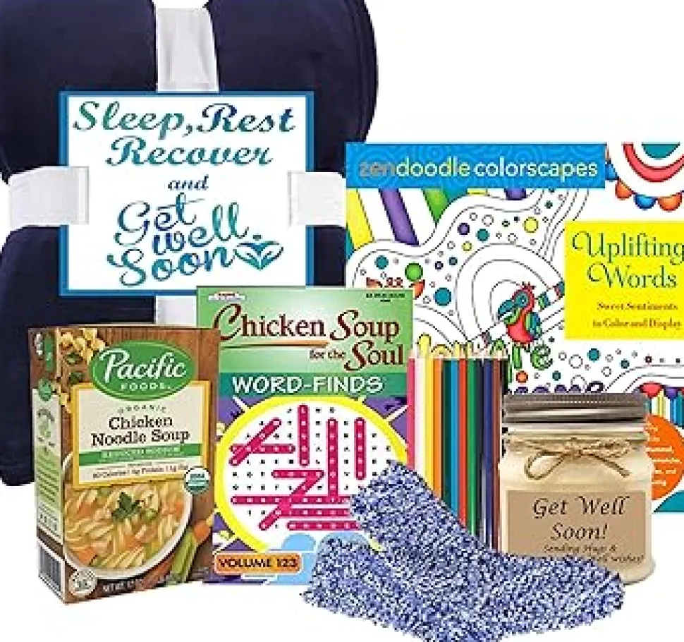 Sleep, Rest and Recover Get Well Gifts For Women – Get Well Gift perfect for get well soon or get well gifts for women after surgery has Chicken noodle soup in hassle free packaging with homestyle vegetables, a cozy blanket with a Sleep, Rest & Recover get well soon gift card, Zen Doodles You’re Amazing adult coloring book, Chicken Soup for the soul puzzle book and more.