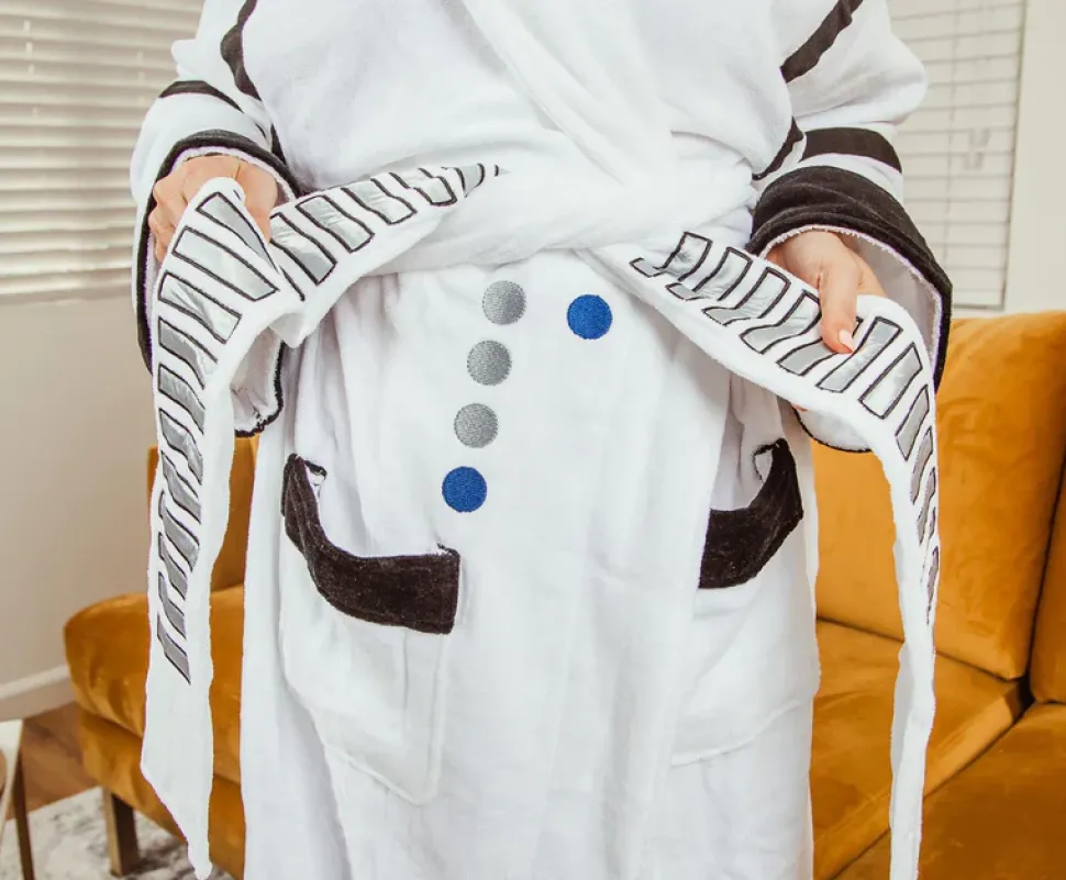 Now, you can own standard-issue Imperial (plush) armor. Styled to resemble a classic Stormtrooper uniform, this plush robe features fine embroidery and detailing.