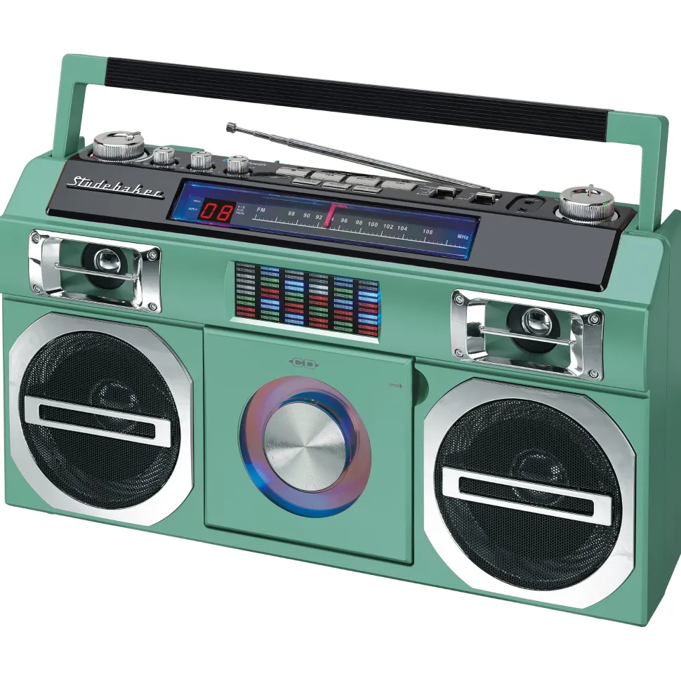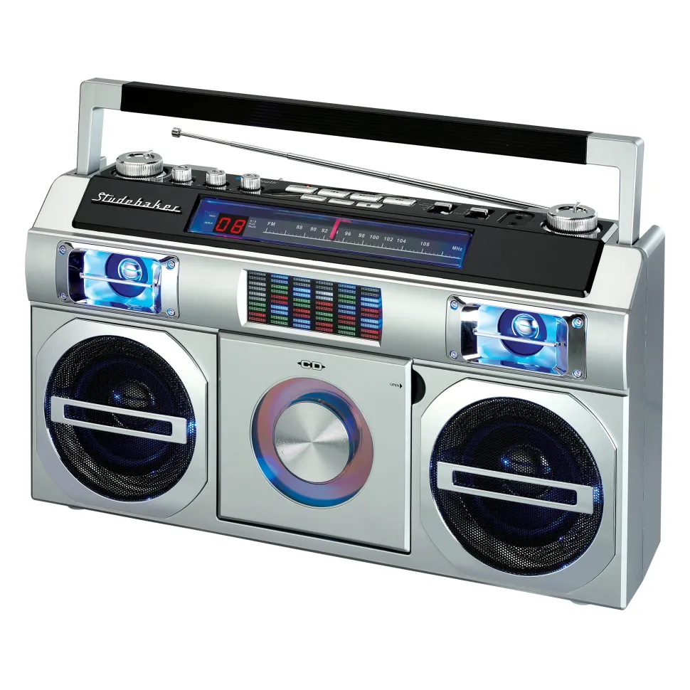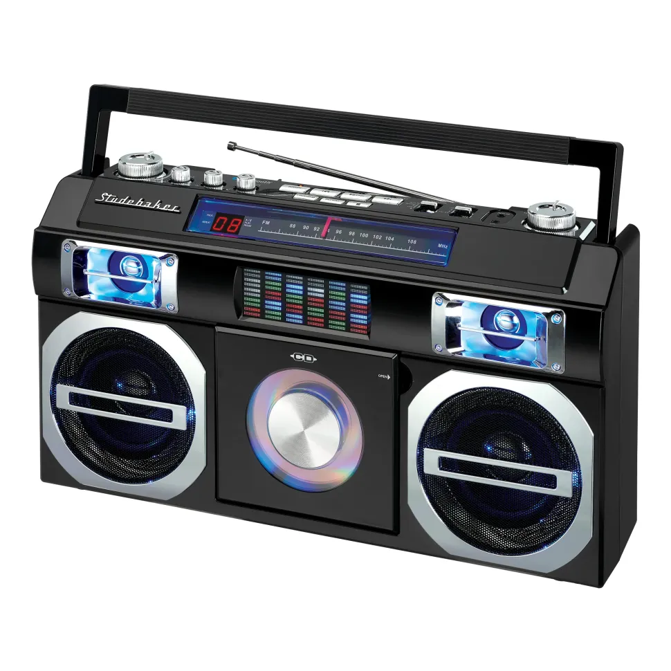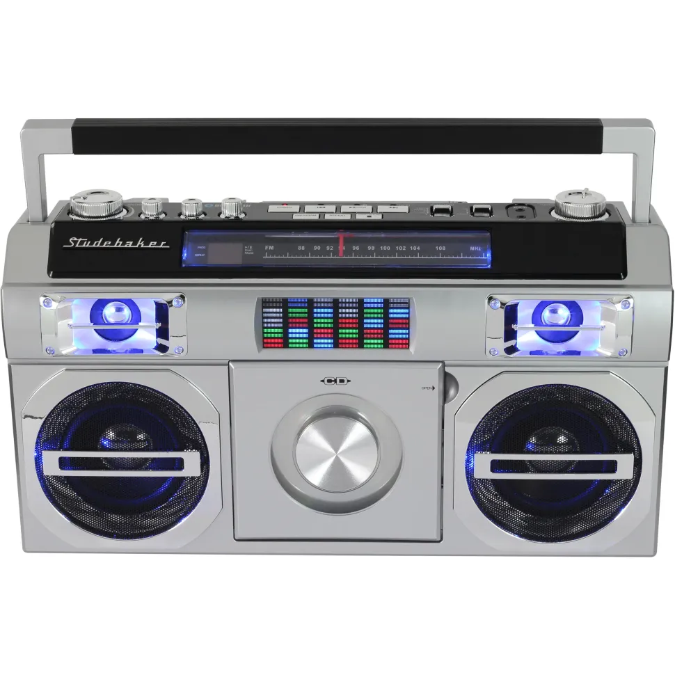 Reminiscent of the boomboxes of old, this portable CD Player with FM Analog Radio also includes Bluetooth connectivity for streaming music. The front loading CD player is CD-R/RW compatible. This unit comes with an auxiliary input jack and headphone jack. Other great features include built-in stereo speakers, rotary volume control, treble and bass adjustments and a convenient carrying handle. A multi-color LED Equalizer adds an exciting visual to this awesome looking unit. There is also a built-in AC transformer and built-in rechargeable battery.