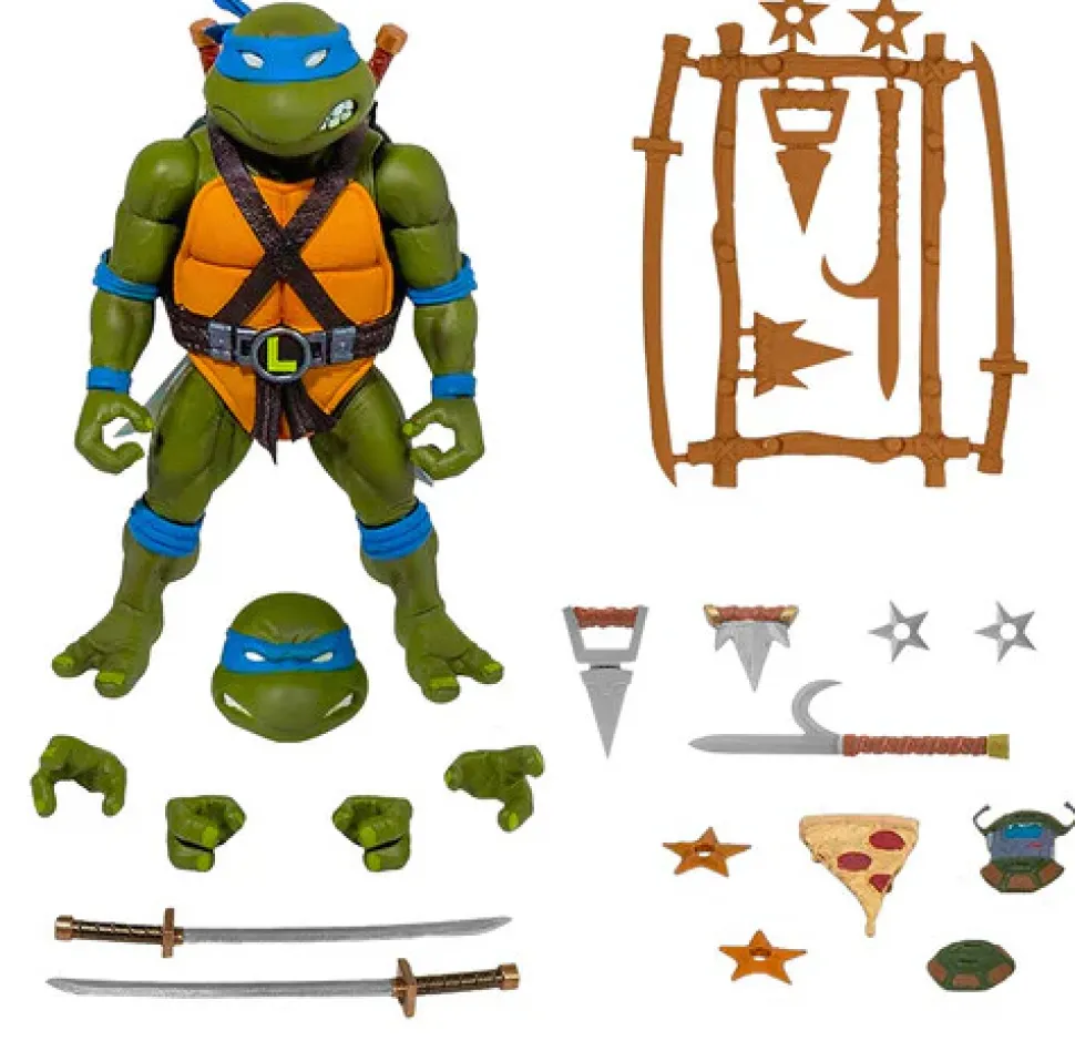 This 7” highly articulated Teenage Mutant Ninja Turtles ULTIMATES! Leonardo figure features interchangeable hands and heads and comes with multiple accessories: pizza (of course), a Turtlecom, and a rack with a variety of ninja weapons including his signature katana.