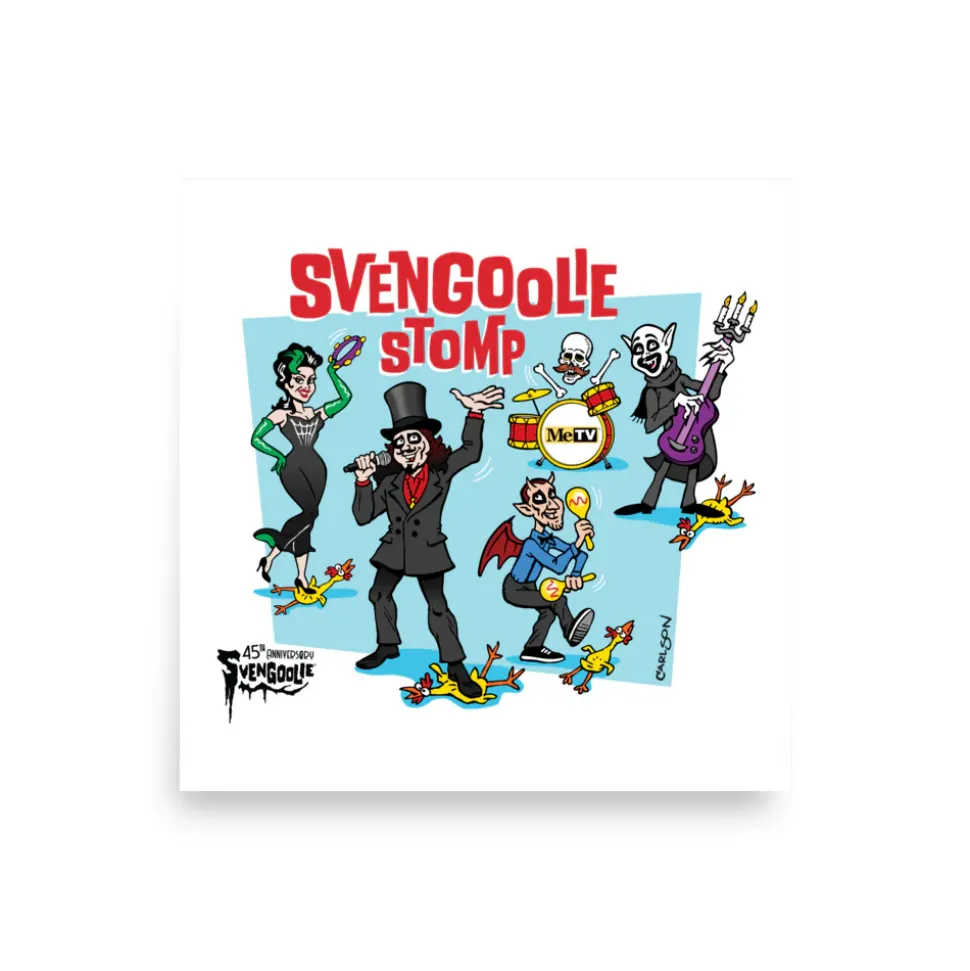 We’re celebrating Svengoolie’s single, , with this new Svengoolie® 45th Anniversary design by artist Jeff Carlson. The music video, starring our favorite horror host with Freddy “Boom Boom” Cannon, shows cast and celebrities stomping on their rubber chickens. This anniversary design imagines the Sven Squad™ grabbing their instruments and joining in the stomp as MeTV’s rock band honoring this moment of Svengoolie history.