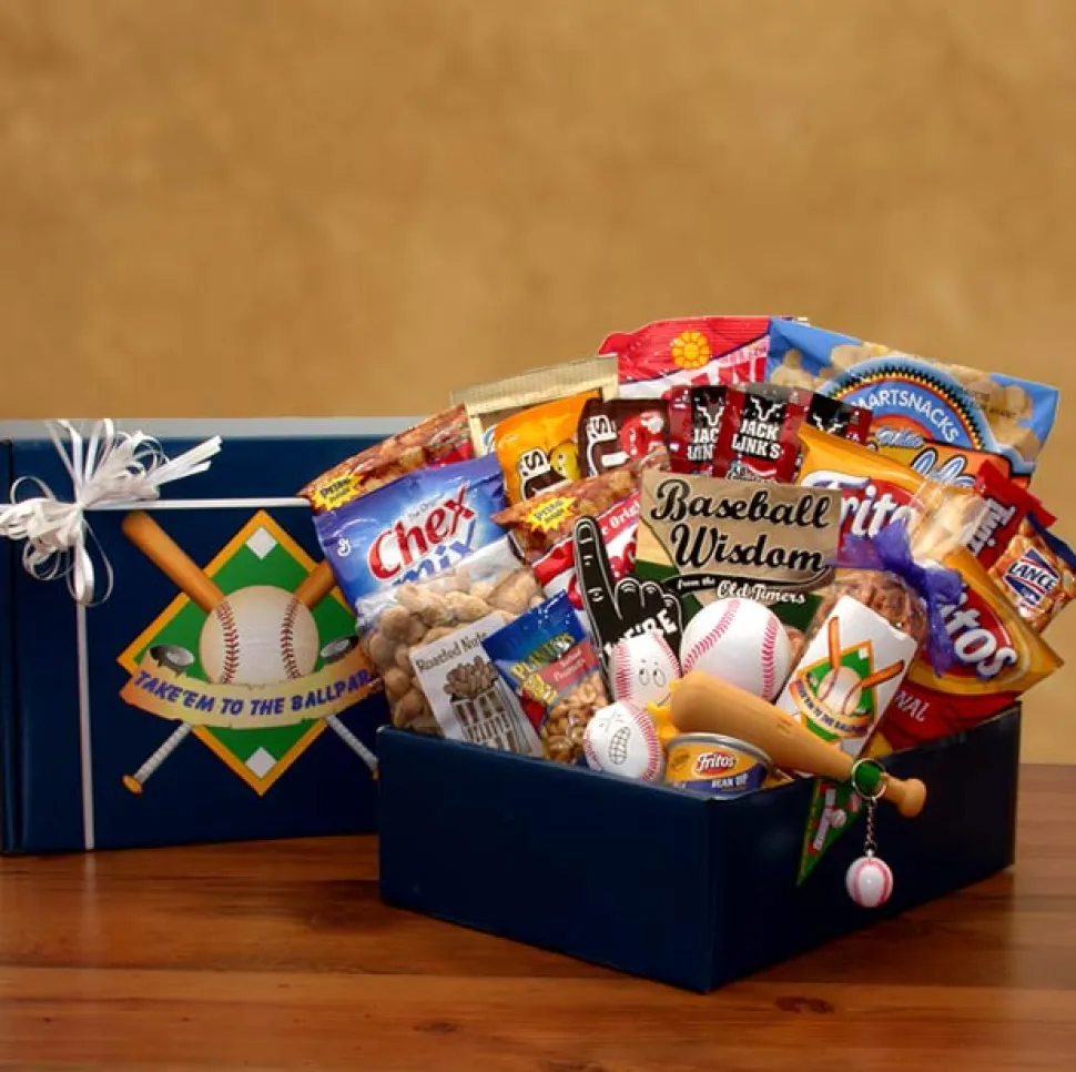 Take Em To The Ballpark Baseball Gift Pack includes: Davidson’s sunflower seeds, white cheddar popcorn, 2 packages Fritos corn chips, Frito’s bean dip, 3 Jerky strips, Cracker Jacks caramel corn with peanuts, Twizzlers, old fashioned Peanut bar, M & M’s peanut candies, M & M’s plain milk chocolate candies, Chex mix, Famous Amos chocolate chip cookies, We’re number 1 foam finger measures 5″ tall, planters peanuts, Roasted & salted peanuts in the shell, 2 baseball slammer balls, baseball, Take Em To The Ballpark mustard pretzels, mini baseball bat filled with Double Bubble gum, Baseball Wisdom From The Old Timers book, 96 pages with stories and quotes from the old timers. Comes packed in a blue gift box as a care package with a baseball field graphic and completed with a hand tied bow. Actual box measures 11″ in length by 10″ in width and 7″ tall.