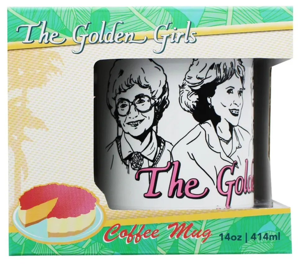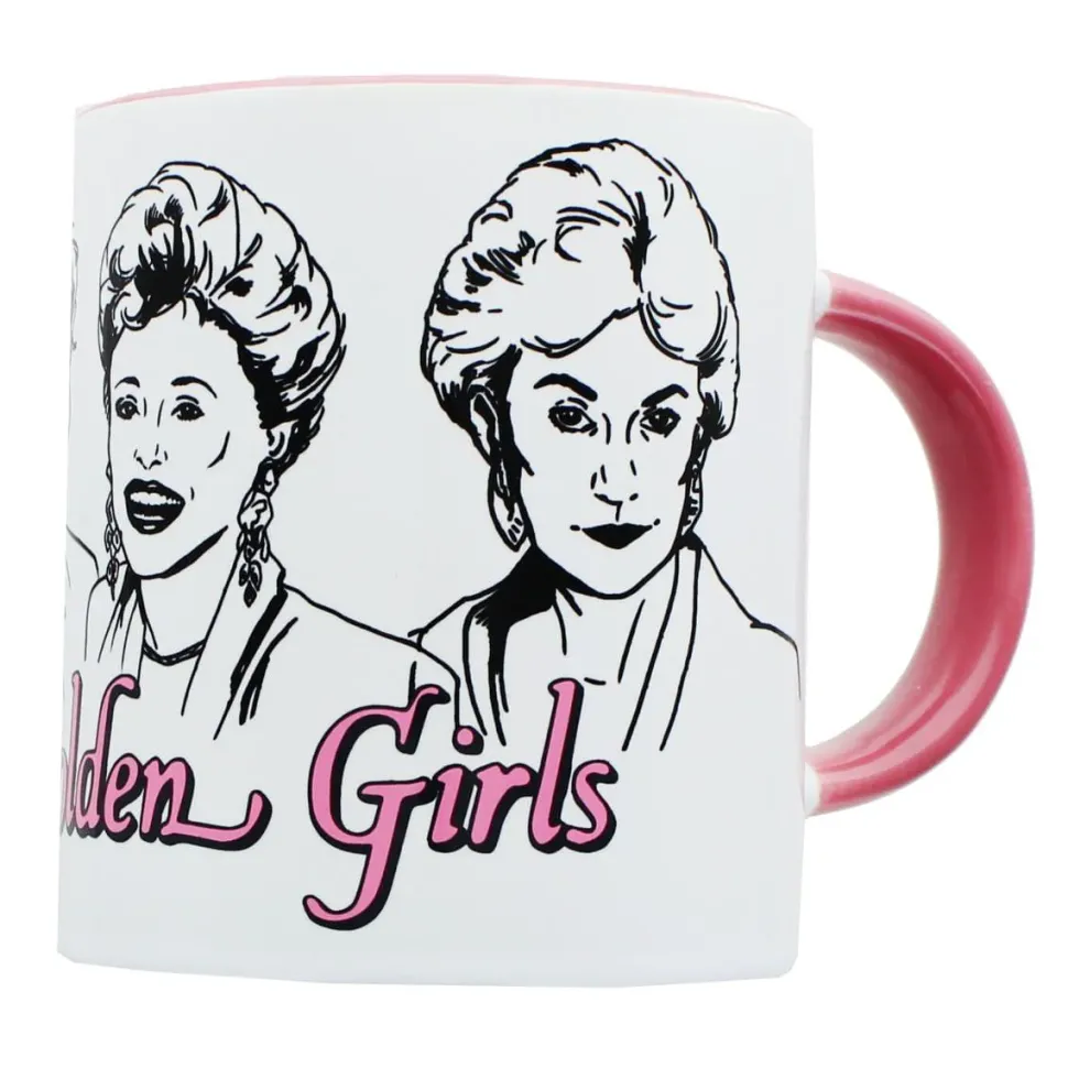 Enjoy a good laugh with this Golden Girls Coffee Mug from the classic ’80s sitcom. Make a statement with trendsetting drinkware that celebrates the “golden years,” featuring fun styling and quality print graphics. Inspired by the comedic foursome, this glossy white coffee mug depicts line art of the show’s iconic main cast, including Rose, Blanche, Sophia, and Dorothy. Of course, it wouldn’t be The Golden Girls without a little pizazz thrown into the mix. In the spirit of their colorful personalities, the cup features an attractive pink logo and matching handle to provide a fun pop of color.