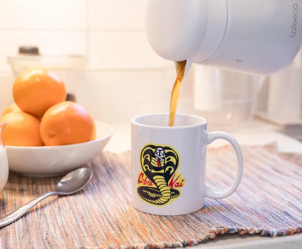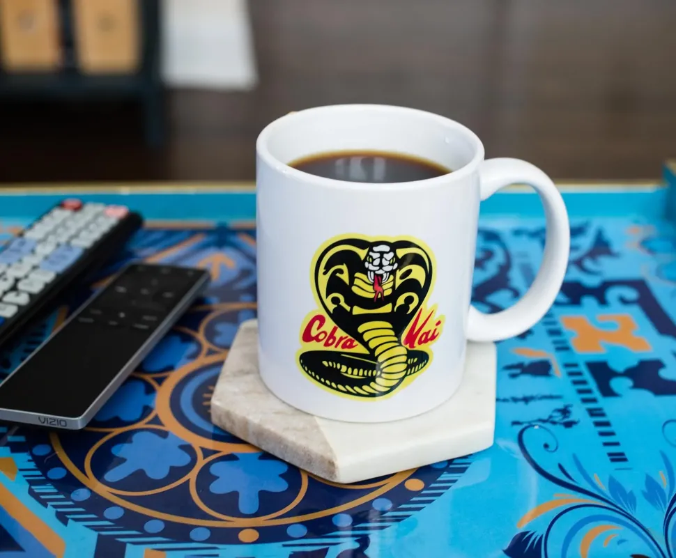 Ready for some bone-crunching, face-smashing, good ol’ American karate? Show no mercy with this exclusive Cobra Kai mug. Inspired by the classic Karate Kid franchise, this collectible drinkware features the iconic Cobra Kai logo. (You know, like the badass snake.)