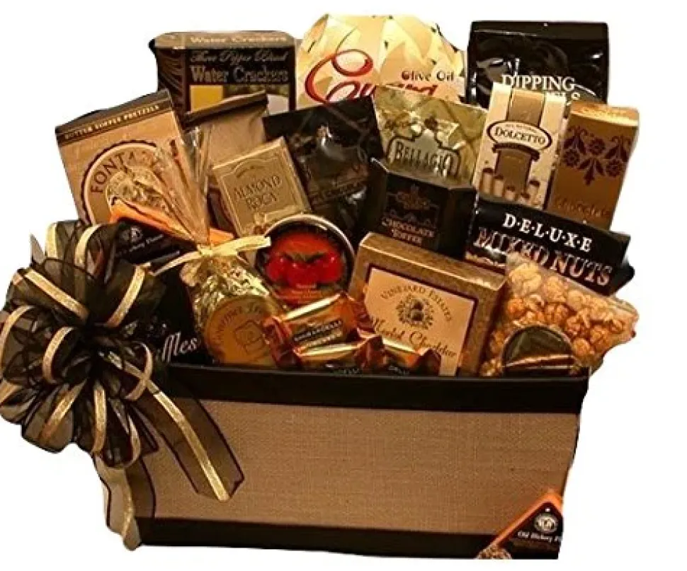 The Metropolitan Executive includes: Faux leather and canvas tray, Special toffees, Cherry bon bons, Ghirardelli caramel filled milk chocolate squares, Butter toffee caramel corn, Merlot cheese spread, Old hickory Wisconsin cheese triangle, Chamberry French truffles, Deluxe mixed nuts, chocolate cream filled wafer cookies, chocolate cream filled Pirrouline wafer cookies, salty dipping pretzels, butter toffee pretzels, 7 oz salami, Almond Roca toffee, Cucina bistro style olive oil chips, Bellagio latte mix, and Bellagio cappuccino mix. Topped with an attractive gold and black hand made bow this gift makes a stylish presentation. This gift measures 14″ long by 8″ wide by 14″ tall and weighs 5 pounds when complete.