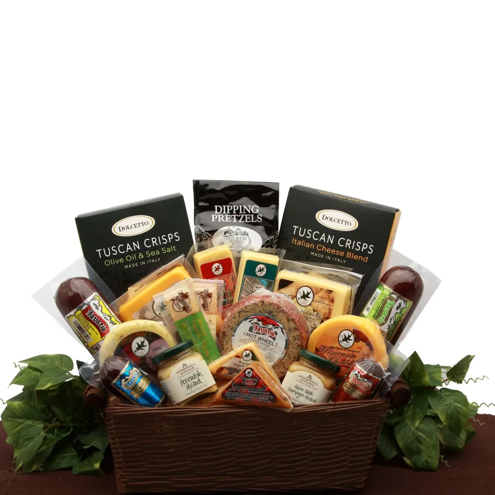 A sophisticated, delicious, and satisfying gift basket. It’s pure heaven for your favorite gourmet foodie. We’ve included a delicious variety of Bavarian smoked sausages, creamy Wisconsin cheeses, and two gourmet mustard spreads.With all of the savory favorites, this makes a great fathers day gift basket, housewarming gift, Birthday gift, or any of the holiday gifts you may need this year.