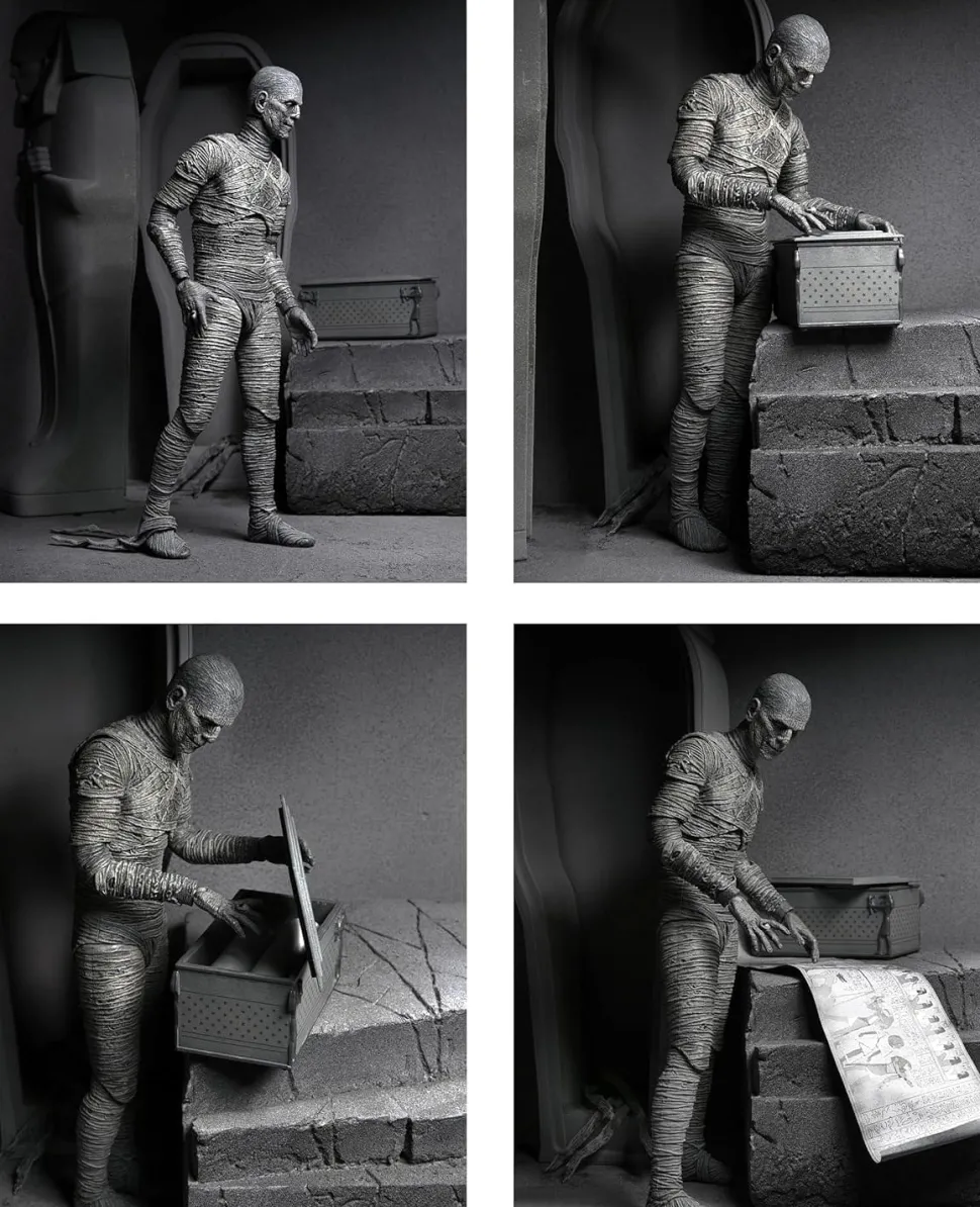 From NECA. For the 90th anniversary of the extraordinary silver-screen classic, NECA presents The Mummy action figure in authentic black-and-white! In this Universal Monsters classic of horror, Boris Karloff shines as the ancient Mummy in a tale of love transcending death. The sculpt captures the intricate special effects makeup that required eight hours to apply and two hours to remove. Standing in 7″ scale, the figure comes in premium packaging with interchangeable heads, interchangeable hands, and an Egyptian chest that opens.