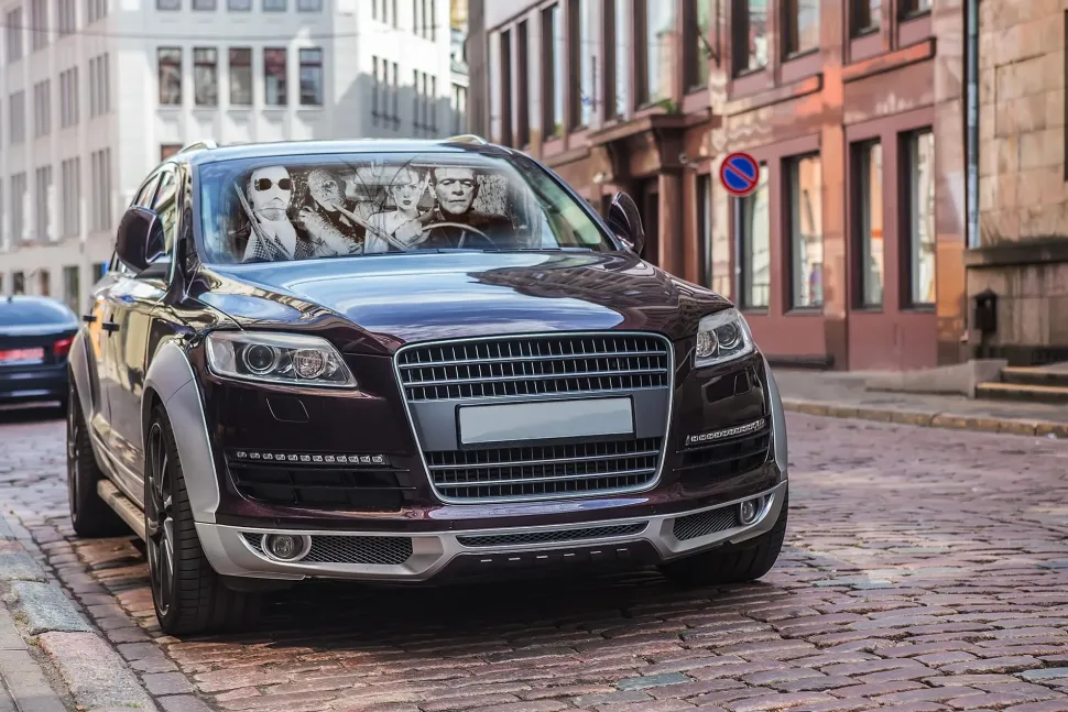 Based on classic horror movies, the villainous styling features a vintage black-and-white design. This spooktacular sunshade makes it look like Frankenstein’s monster is driving your vehicle — with the Invisible Man, the Mummy, and the Bride of Frankenstein all along for the ride!