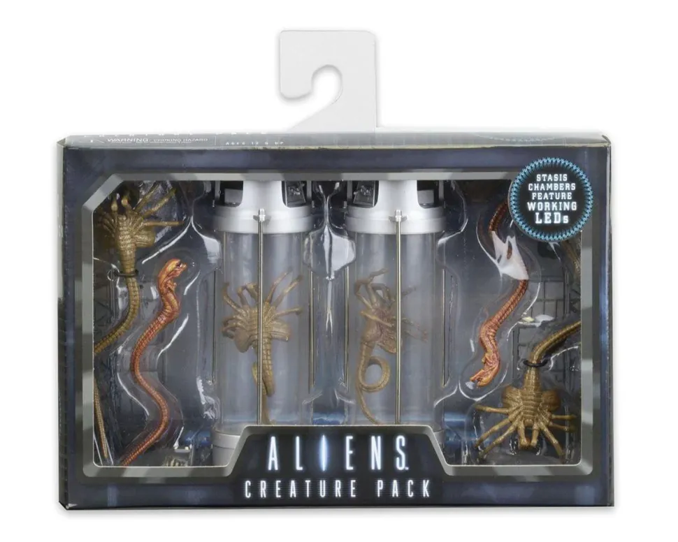 To celebrate the 30th anniversary of the Aliens, NECA has released a deluxe creature pack that includes some frequently requested favorites from the terrifying movie! These six pieces will make for some mind-blowing dioramas, since they’re perfectly in scale with NECA’s line of 7-inch figures. Set includes 2 Stasis Chambers with LED Lights: Press a button to cast an eerie glow on the facehugger preserved within it (batteries included)! You can even fill the tube with water if you choose. Also included in this set are two (2) Chestbursters with bendable tails and four (4) Facehuggers with bendable tails. The Facehuggers can be removed from the Stasis Chambers.