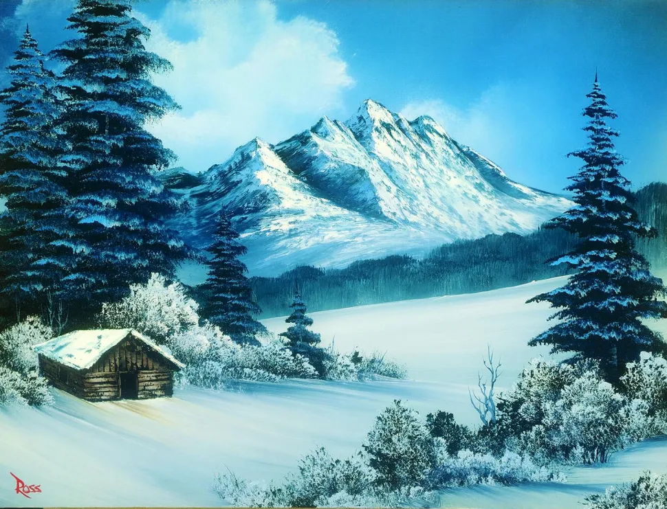 Unlock the joy of painting with this Bob Ross A Perfect Winter Day 1000-Piece Puzzle. Measuring 28 x 20 inches, the completed jigsaw puzzle depicts a wintery paradise in a beautiful nature clearing. The chilly scene features a snow-covered landscape, including “happy little trees” that make up the surrounding forest and picturesque “almighty mountains” in the distant backdrop. A single log cabin can be spotted in the forefront near the edge of the forest clearing, adding to the serene atmosphere of the image.