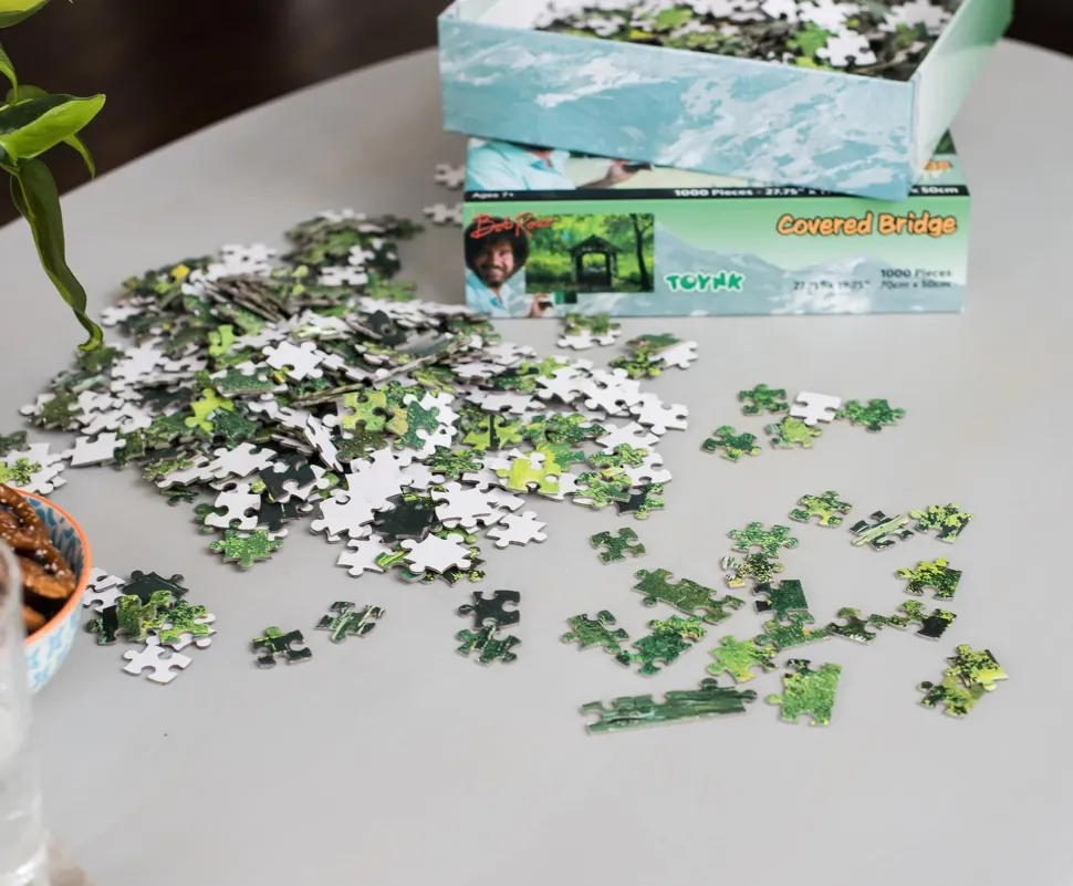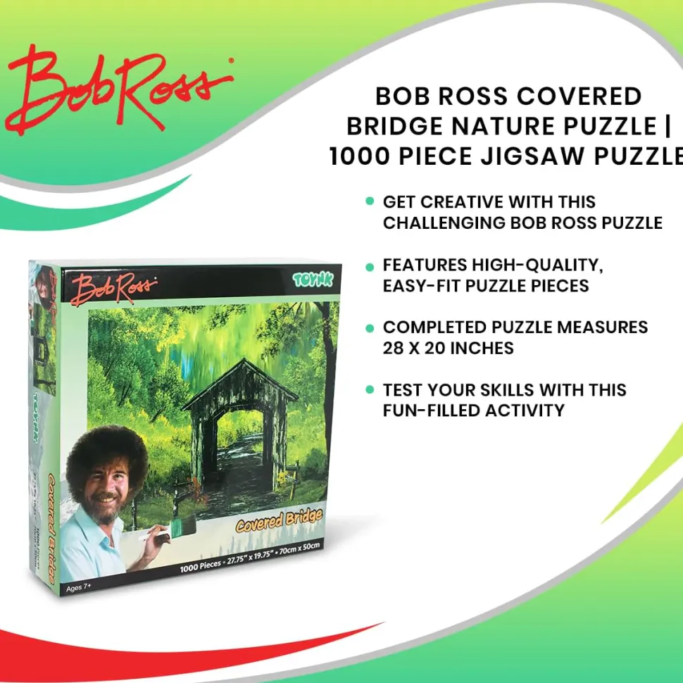 Unlock the joy of painting with this Bob Ross Covered Bridge 1000-Piece Puzzle. Measuring 28 x 20 inches, the completed jigsaw puzzle depicts an awe-inspiring woodland scene full of greenery. The peaceful image features a moss-covered landscape, with “happy little trees” surrounding a secluded pathway that is covered by a small wood hut. Bursting with nature, you can assemble each section of the trees, shrubs, and brush piece by piece as you put the puzzle together.