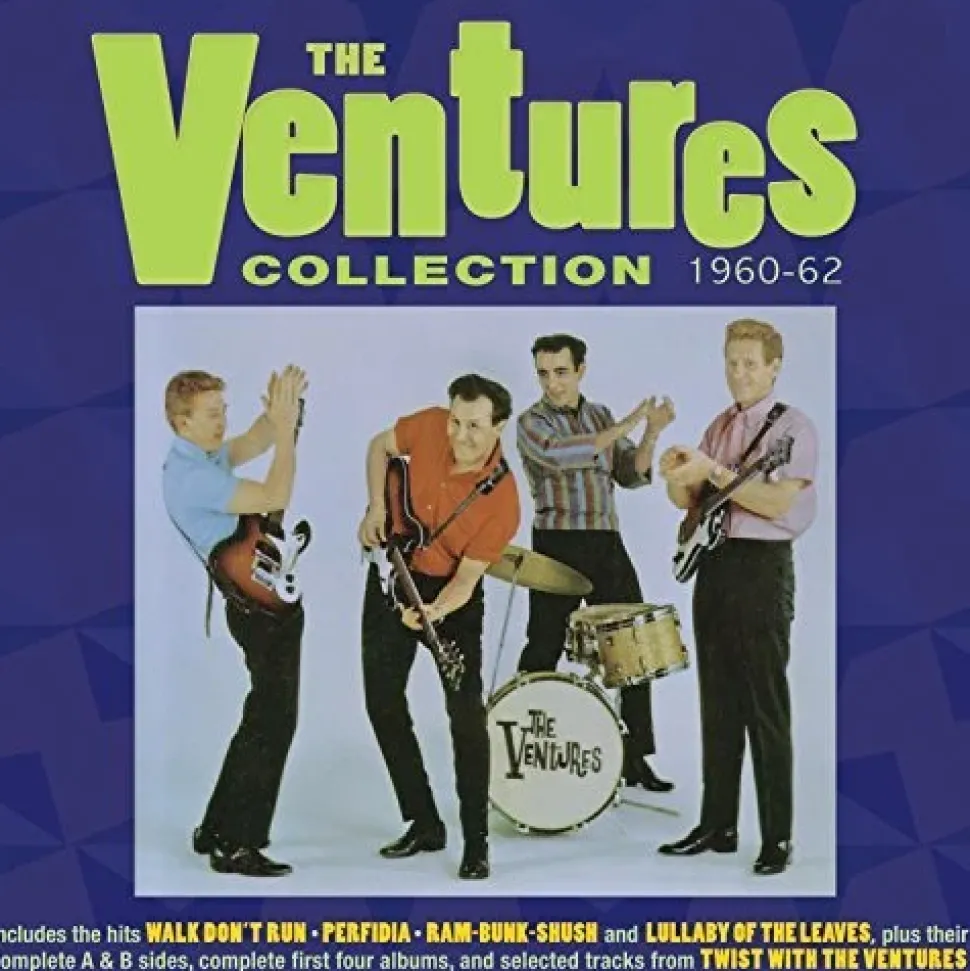 The sub-genre of guitar instrumental hits is a fascinating musical strand of rock ‘n’ roll, with Duane Eddy representing it’s primary high-profile chart vanguard, but it was with groups like The Ventures in the USA and The Shadows in the UK that it expanded in the first years of the ’60s to inspire a generation of teenagers to buy a guitar and learn to play the hits – indeed, the Ventures were later afforded the occasional accolade of being “The Band that Launched a Thousand Bands”. They formed in Seattle in 1958, playing local gigs, and heard “Walk Don’t Run” as a solo finger-style piece on a 1958 Chet Atkins album – their decision to adapt it was an inspired one. It was released on the small Dolton label on the west coast, owned by country star Bonnie Guitar, and sold a million copies reaching No. 2. They went on to become one of the industry’s most longest-running and successful groups worldwide, building an especially strong following in Japan. This great-value 64-track collection (some of their records were legendarily short) is a comprehensive overview of the initial era of the career, comprising all their A & B sides during the period, and the complete content of their first four albums, “Walk Don’t Run”, “The Ventures”, “Another Smash” and “The Colorful Ventures”, plus selected tracks from their 1962 LP “Twist With The Ventures”. It is therefore a comprehensive look at their formative career, naturally including classics like “Walk Don’t Run”, “Perfidia”, “Ram-Bunk-Shush” and “Lullaby Of The Leaves”.