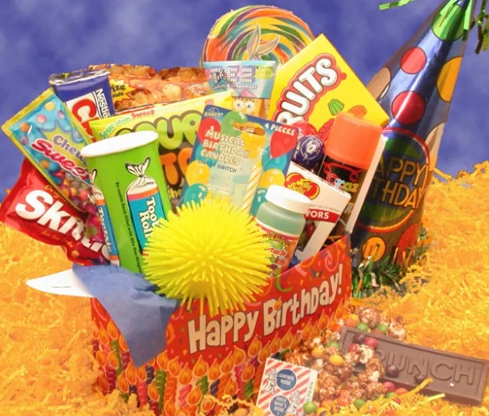 The Deluxe Happy Birthday Care Package will be the hit of the party! The bright happy Birthday gift box is filled with sweet treats and savory snacks that will have all the birthday guests licking their lips! Musical birthday candles and silly string will add to the fun as the birthday boy or girl unwraps this Deluxe Happy Birthday Care Package!