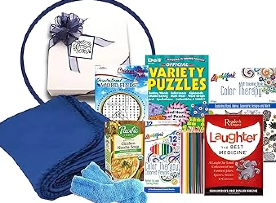This get well soon, get well gifts for women includes: 60×70 all fleece blanket, pill resistant, Kappa Variety puzzle book, Chicken Soup For The Soul word find puzzle book, Color Therapy Adult coloring book with over 48 tear out pages of mandala’s, Color Therapy colored pencil set, Reader’s Digest Laughter Is The Best Medicine book, All organic chicken noodle soup, warm fuzzy socks, Two Piece white gloss gift box with a handmade bow and our exclusive get well soon gift card.